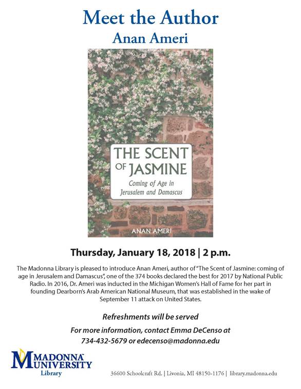 Dear colleagues, If you are able, please find yourselves invited for our author event. Anan Ameri is author of "The Scent of Jasmine: coming of age in Jerusalem and Damascus" one of the 374 books declared the best for 2017 by National Public Radio. In 2016, Dr. Ameri was inducted in the Michigan Women's Hall of Fame for her part in founding Dearborn's Arab American National Museum, that was established in the wake of September 11 attack on US. Neda Ulaby, NPR's art correspondent wrote about "The scent of Jasmine", the following; "A vibrant collection of vignettes evokes the author's childhood in Damascus, Syria, and Jerusalem and her coming-of-age in Amman, Jordan, and Cairo in the 1950s and '60s. Each chapter is linked by the era's heady political atmosphere, which Ameri's family fully participated in, and the aroma of jasmine, which grew in abundance in the courtyard of her grandfather's elegant Damascus home. [cid:image001.jpg@01D38887.4893BAC0] Thank you and hope to see you on January 18. Emma Emanuela DeCenso B.S., M.L.I.S. Reference and Instruction Librarian Liaison to the College of Arts and Humanities Liaison to the College of Education Madonna University Library 36600 Schoolcraft Rd. Livonia, MI 48150 734-432-5679<tel:734-432-5679> edecenso@madonna.edu<mailto:edecenso@madonna.edu> Current hours: Mon-Wed-Thur 8:00 am - 4:30pm Tues-1:30-10pm "The lasting pleasures of contact with the natural world are not reserved for scientists but are available to anyone who puts himself under the influence of earth, sea and sky, and their amazing life." -Rachel Carson P Please consider the environment before printing this e-mail IMPORTANT NOTICE TO EMAIL RECIPIENTS: This email communication may contain confidential information intended only for the addressees. Please do not read, copy, or disseminate this communication unless you are the intended addressee. If you have received this message in error, treat it as confidential and please notify the sender by reply email, destroy the original message, all content and copies.