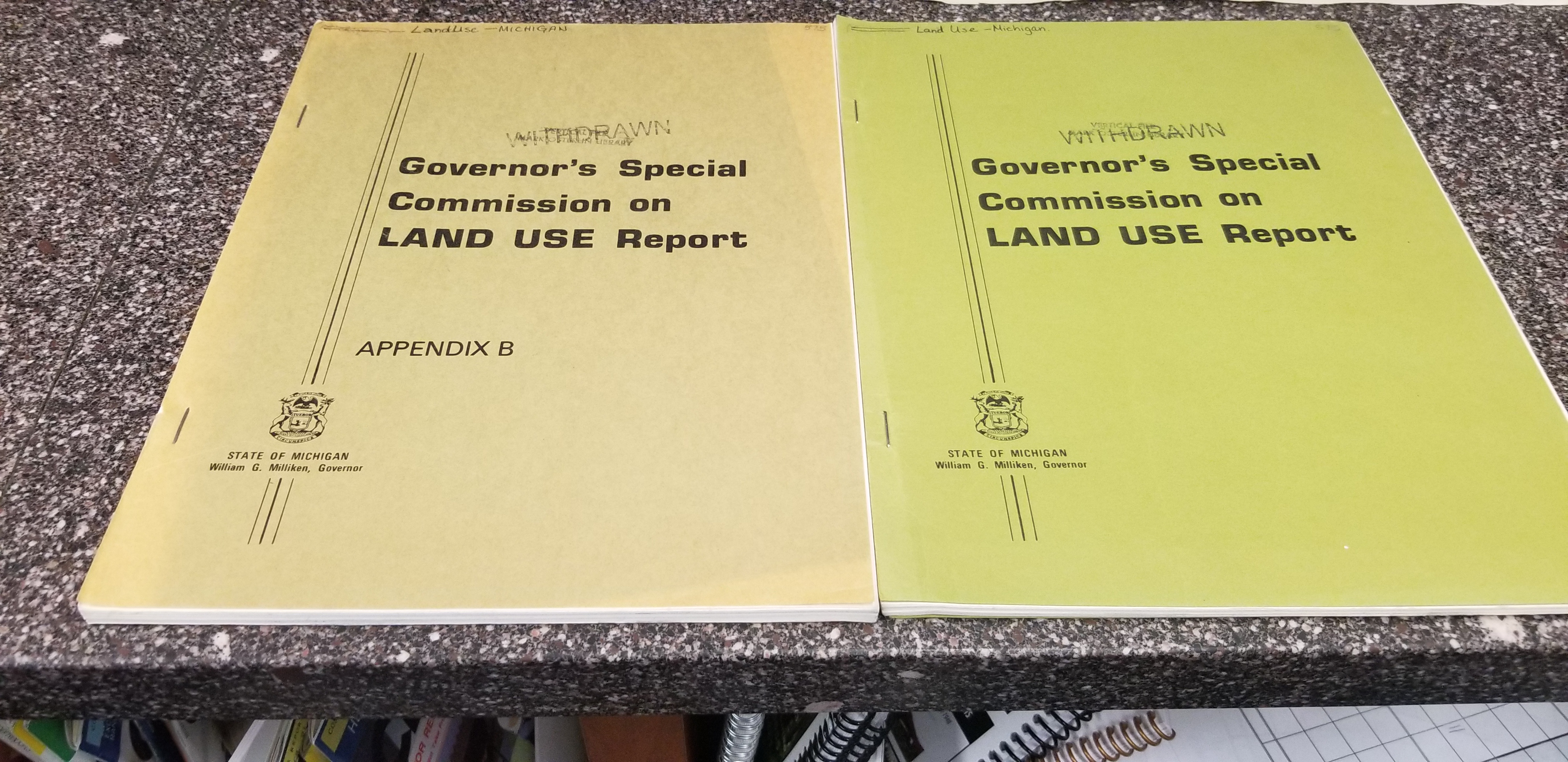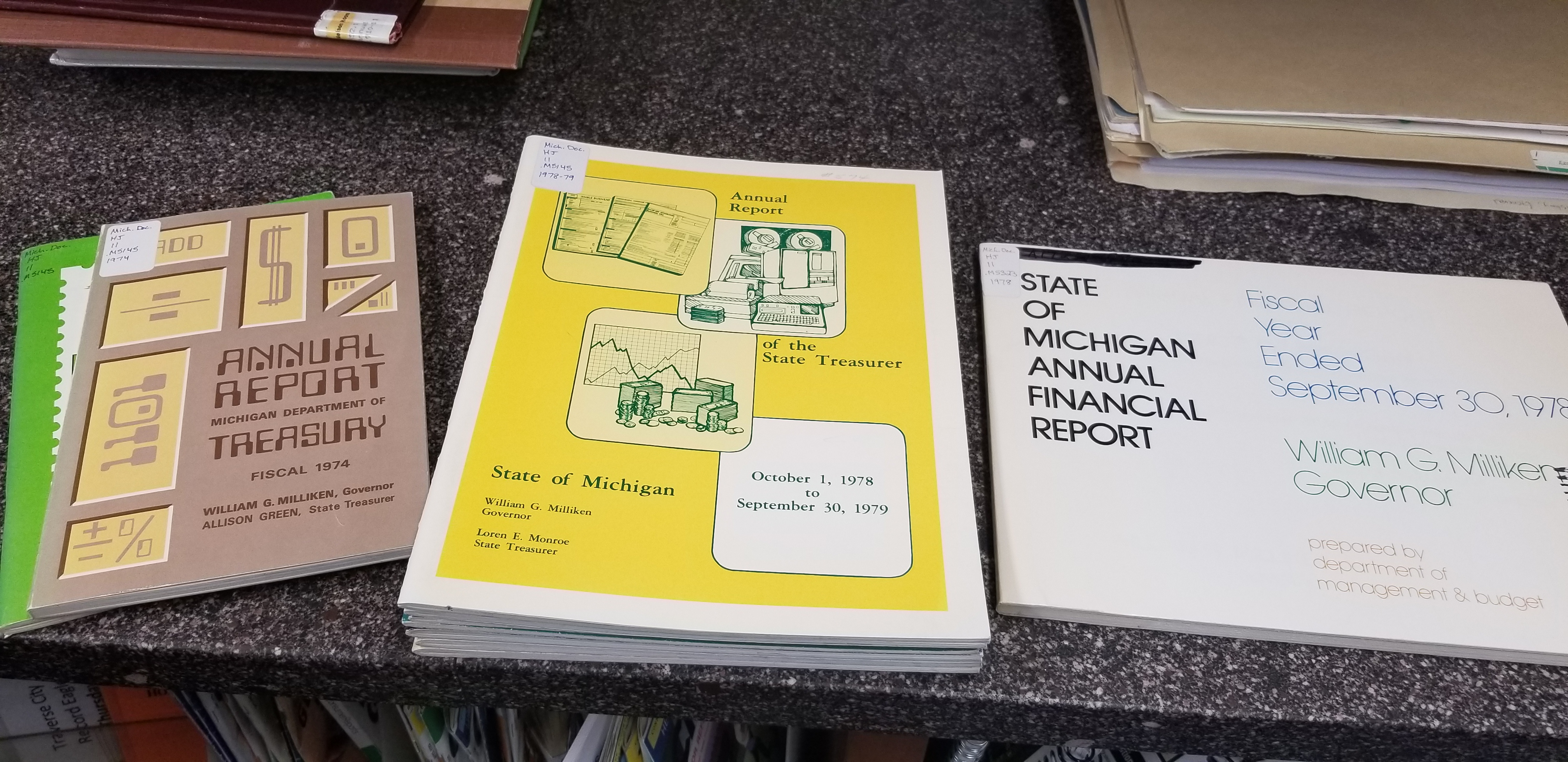 *Budget Message of the Governor (1974-1982)* *Economic Report of the Governor (1975-1982)* *Employment Plan of the Governor (1981-82)* *Executive Budget, State of Michigan (1976-1983)* *Governor's Special Commission on Land Use Report (1971 Appendix B, 1972)* *Michigan Compiled Laws Volumes 1-6, 1979* *Michigan Compiled Laws Volumes 1-6, 1948* *Michigan Compiled Laws Volumes 1-6, 1970* *Annual Report, Michigan Department of the Treasury (1974, 1975, 1975-78, 1978, 1978-82)*