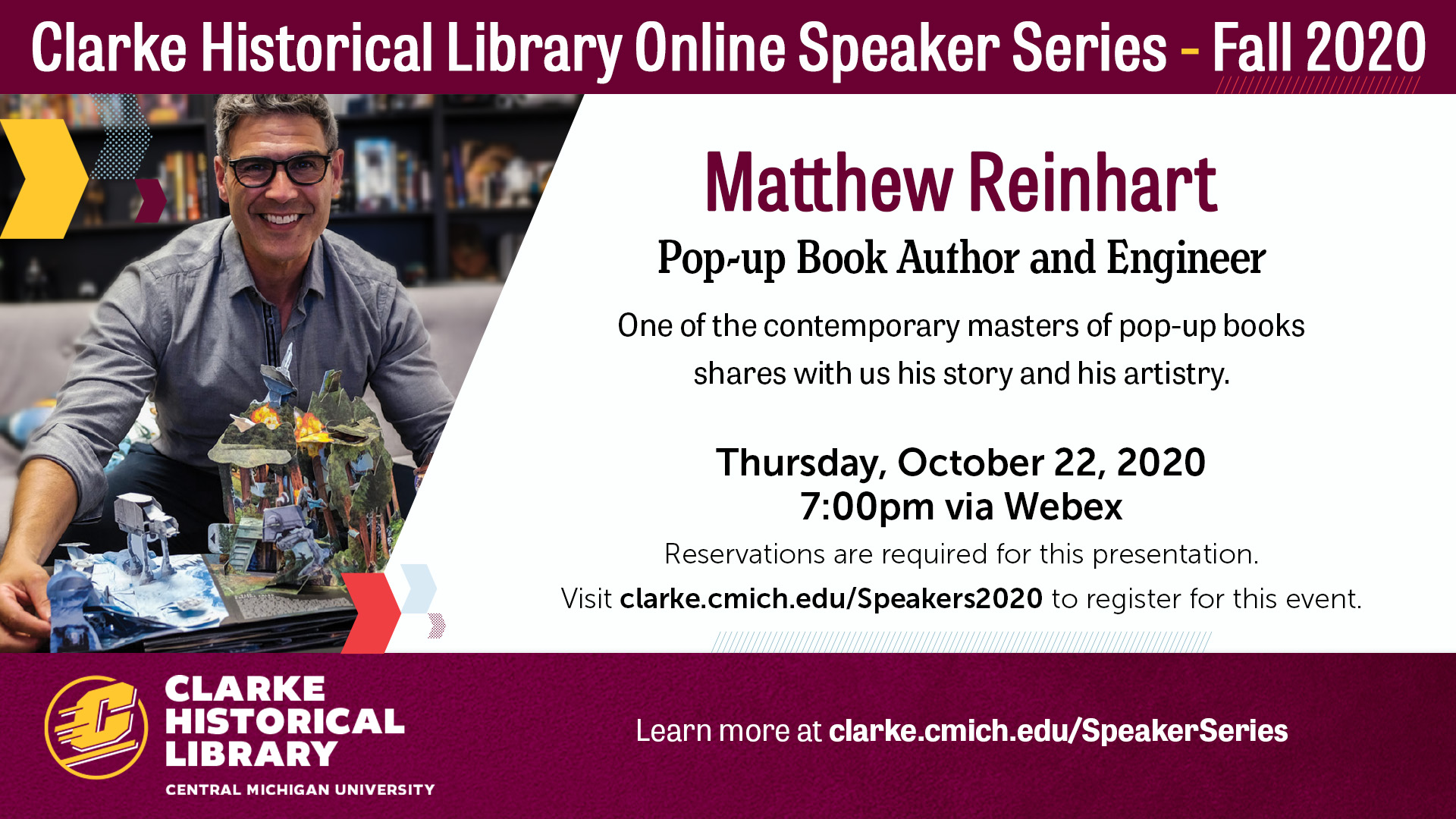 The Clarke Historical Library at Central Michigan University is delighted to welcome Matthew Reinhart, an internationally renowned paper engineer and pop-up book author (https://en.wikipedia.org/wiki/Matthew_Reinhart). His award-winning works employ a variety artistic and paper-engineering techniques to make seemingly simple books unfold into beautiful 3-D objects, only to fold back onto themselves with the turn of a page. Here is a video of one of his books - Star Wars: A Galactic Pop-up Adventure - in action: https://www.youtube.com/watch?v=I8fxp4oJyPs Come learn about his works, how he landed in this career, what inspires him, and even how you can create your own pop-up! The presentation is this Thursday, October 22, at 7:00 pm. It is free and open to the public. The event will be broadcast via Central Michigan University's videoconferencing tool, Webex, and it will be recorded to enjoy it at a later time. Registration is required for the event and the shortened link to register is: https://bit.ly/2TamNv7 Feel free to share this information far and wide! The Clarke is happy to answer any questions that anyone may have-please contact Bryan Whitledge (whitl1br@cmich.edu<mailto:whitl1br@cmich.edu>). Have a great day, Bryan Whitledge Archivist for University Digital Records Clarke Historical Library Central Michigan University 989-774-2159 whitl1br@cmich.edu<mailto:whitl1br@cmich.edu>
