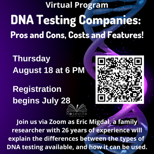 Hi all, Please share with anyone who might be interested: Virtual Program: DNA Testing Companies: Pros and Cons, Costs and Features! Join us via Zoom as Eric Migdal, a family researcher with 26 years of experience will detail how DNA testing can be used and explain the differences between the types of DNA testing available. This program will be held virtually via Zoom and all are welcome! Please register here: http://rosevillelibrary.org/wordpress/event-calendar/#/events/LYIVlcMcpq/ins... or call the Library at (586) 445-5407. Tracy Wilson Assistant Director/Adult Services Coordinator (P) 586-447-4552 twilson@roseville-mi.gov rosevillelibrary.org<http://rosevillelibrary.org/> [5D65F147]