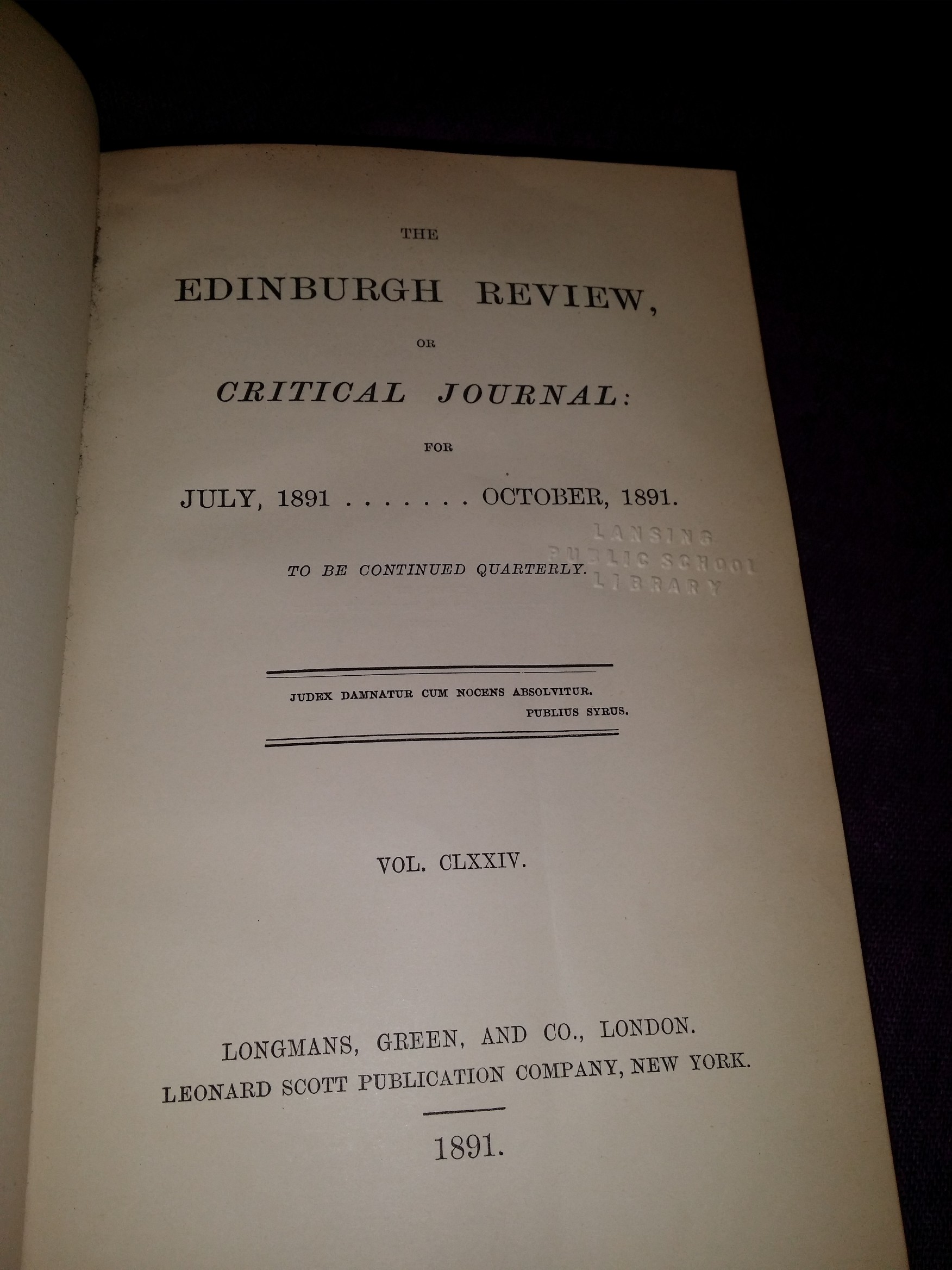 Hi all, CADL has 17 boxes of hardcover Edinburgh Review volumes dating from the 1800s, free for pick up. Boxes are sealed, no information available on volume range - there are approximately 15 volumes per box, 17 boxes total. Example copy picture attached: Ediburgh Review, July 1891 - October 1891, Vol. CLXXIV Items must be picked up at our Downtown Lansing location. Please contact me off list with questions or to check availability/arrange pick up times. Thank you and have a great day, Heather Heather Goupil, Purchasing Assistant Capital Area District Libraries - Administration 401 S. Capitol Avenue, Lansing, MI 48933 517-334-1531 | goupilh@cadl.org<mailto:goupilh@cadl.org> www.cadl.org<http://www.cadl.org/>