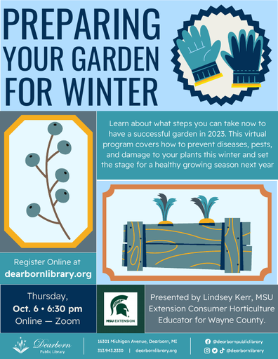 Good afternoon, All. Please see the attached flyer related to an upcoming program. Lindsey Kerr of the MSU Extension will host a zoom based talk on Preparing your garden for winter. The event takes place on 10/6/22 at 6:30 PM. Feel free to share. Learn more and register here: https://bit.ly/3DI78LS Joseph Wasukanis Librarian Dearborn Public Library Henry Ford Centennial Library 16301 Michigan Avenue 313-943-2121 [cid:image001.jpg@01D8CEA2.8152CA20][cid:image002.png@01D8CEA2.8152CA20]
