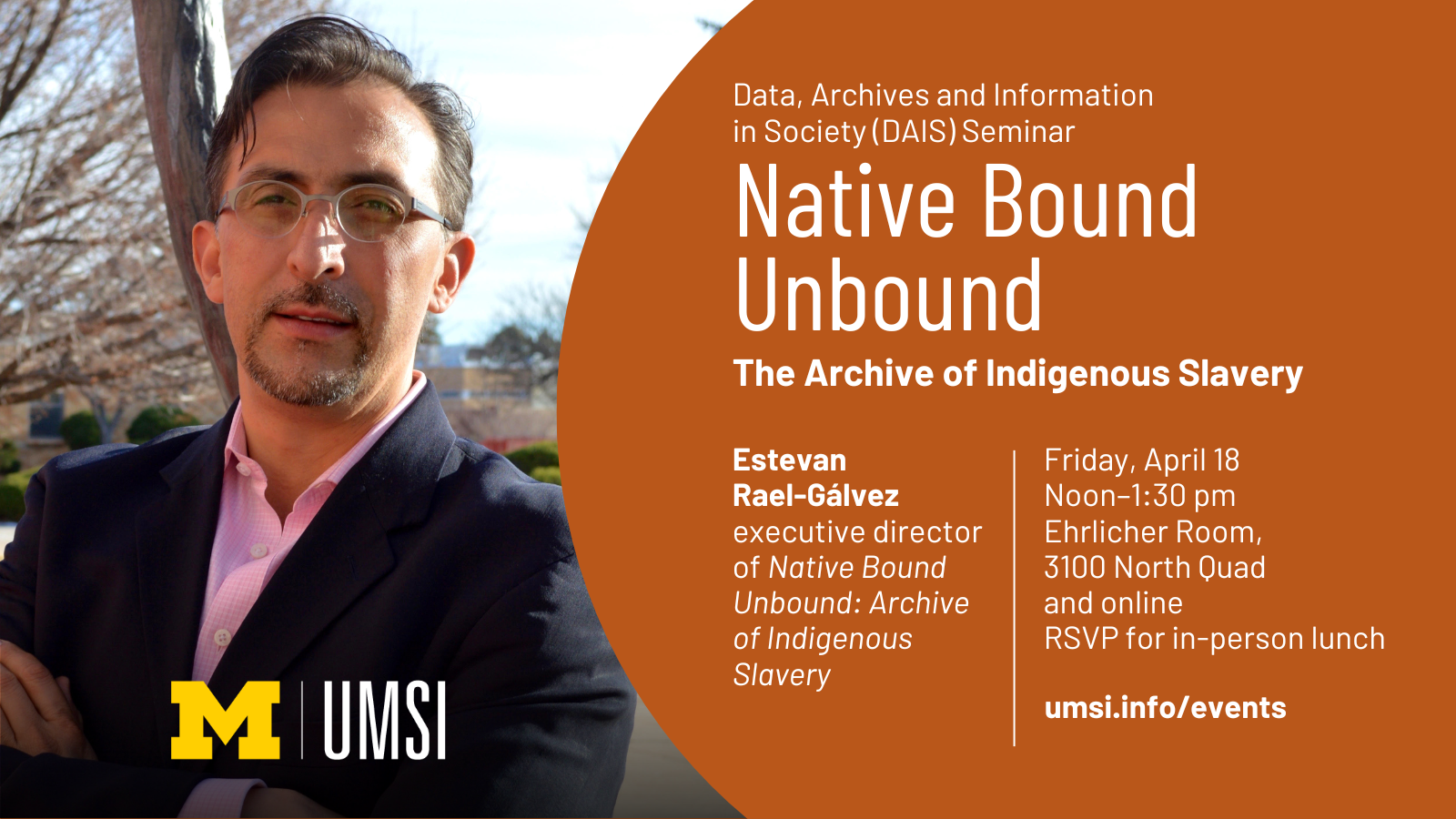 Colleagues, I'm sharing an invitation to a webinar/talk by Estevan Rael-Gálvez, sponsored by the University of Michigan School of Information. The talk will be available on Zoom (or in person if you are in the Ann Arbor area, click below for details), on Friday, April 18 at noon (eastern time). Dr Rael-Gálvez will discuss Native Bound Unbound, a project to digitize and join together archival records documenting Indigenous slavery in a global context. *Details and link below:* [image: DAIS Seminar.png] *DAIS Seminar Speaker**:* Dr. Estevan Rael-Gálvez, Executive Director of Native Bound Unbound: Archive of Indigenous Slavery *Title: * The Archive of Indigenous Slavery Abstract & bio <https://si.umich.edu/about-umsi/events/data-archives-and-information-society-seminar-estevan-rael-galvez> Noon - 1:30 PM (eastern time) Friday, April 18 Register to attend the seminar online <https://umich.zoom.us/webinar/register/WN_7qO_7ryOQF6HdpPSdgA0rw>. This Data, Archives, and Information in Society (DAIS) Seminar is sponsored by the Carnegie Fund at the University of Michigan School of Information. Please see our research group page for a list of previous and upcoming DAIS talks <https://iarg.si.umich.edu/activities/dais>. -- Jesse A. Johnston Clinical Assistant Professor, University of Michigan School of Information <https://www.si.umich.edu/people/jesse-johnston> Secretary and Executive Director, National Recording Preservation Foundation <https://www.recordingpreservation.org/> email: jajohnst@umich.edu voicemail: (734) 764-2107 The University of Michigan is located in the traditional territories of the Anishinaabe speaking peoples, including the Bodewadami, Odawa, and Ojibwe, who continue to live in and steward the lands and the waterways of the state and the region. These land and water resources continue to benefit us, materially and intellectually, and remain a debt of obligation for the University to provide education, benefit, and knowledge to all peoples of the State of Michigan.
