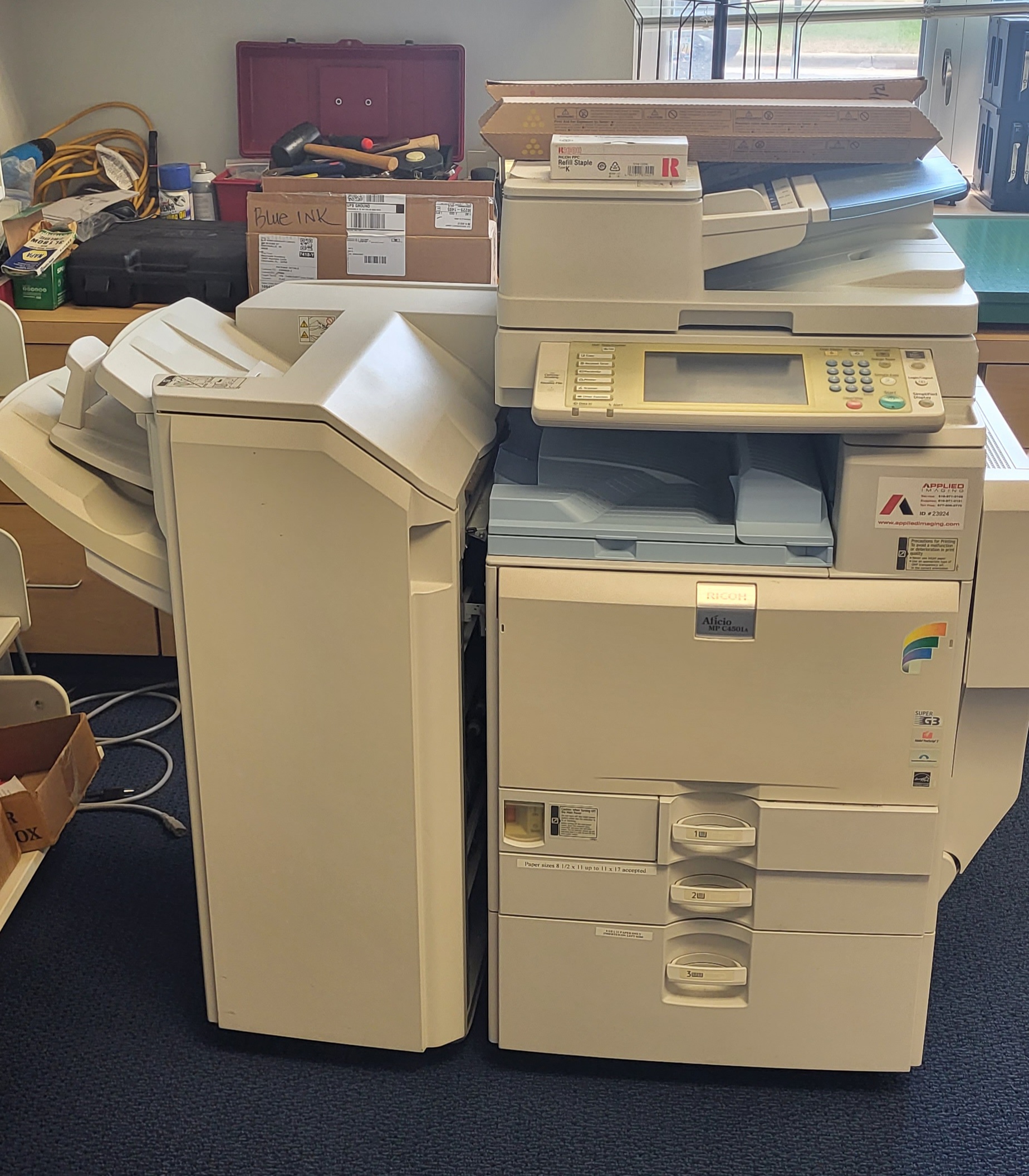 Hi friends, Yes, I said FREE COPIER! We have a Ricoh Aficio MPC4501A copier we are no longer using and need to give it away to the first responder! This machine was only used by staff and has been a real workhorse for us. We've kept it well maintained and it still runs great. (see attachment.) The copier has toner in it and comes with an extra Yellow and Magenta cartridge. It also comes loaded with staples and an extra box of staples too. You will need to pick it up and load it yourself. Thanks! Sincerely, Veronica Pitchford (she/her) Assistant Director Flat River Community Library [ http://www.flatriverlibrary.org/ | www.flatriverlibrary.org ] [ mailto:grevp@llcoop.org | grevp@llcoop.org ] (616)754-6359 ext 106