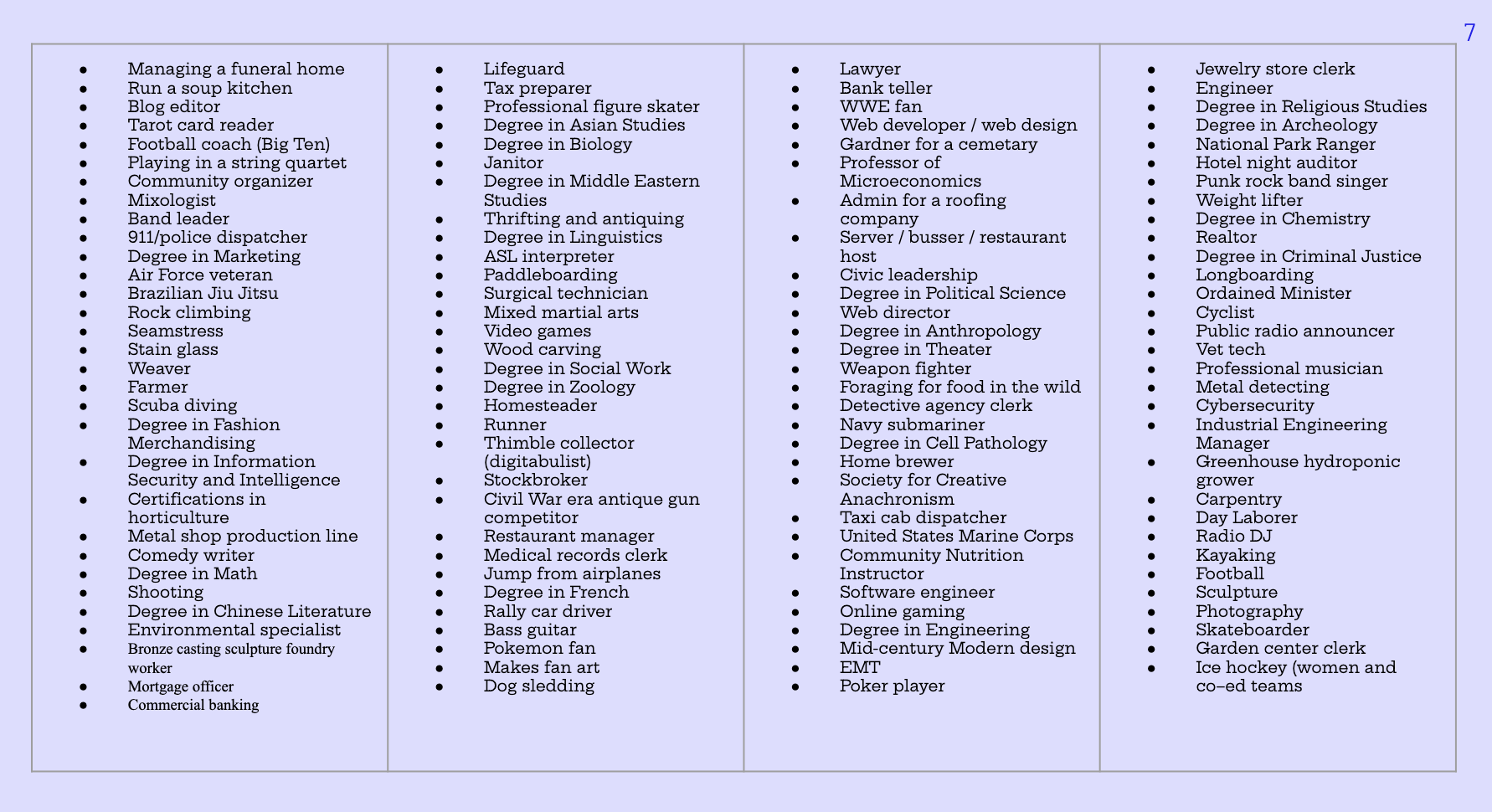 Good evening! I received over 50 responses! Coupled with my survey in other places, I compiled a list of nearly 100 jobs and hobbies that are not librarianesque. I'll send out the presentation when it's finished! I had to drop the font size to 7 to get it all in. :) [image: librarianjobsandhobbies.png] Lisa Rabey | @heroineinabook <https://linktr.ee/heroineinabook>https://linktr.ee/heroineinabook