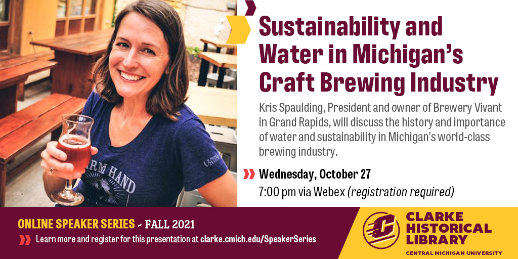 On Wednesday, October 27, at 7:00 pm EDT, the Clarke Historical Library at Central Michigan University will host the third of four presentations as part of the Clarke's Virtual Fall Speakers Series (you can find the entire line-up on the Clarke's website<https://www.cmich.edu/library/clarke/publicprograms/current_exhibit/pages/default.aspx#speakers>). An industry with a long history in Michigan and that has a major impact on today's economy, brewing relies on clean water to create high-quality beer. Kris Spaulding, president and owner of Brewery Vivant in Grand Rapids, will discuss the history and importance of water and sustainability in Michigan's world-class craft brewing industry. Joining her for this conversation will be Margrethe Kearney, a senior attorney with the Environmental Law and Policy Center. Learn about how innovative brewers work to protect Michigan's most precious natural resource This presentation is free and open to the public. The event will be broadcast via Central Michigan University's videoconferencing tool, Webex, and it will be recorded to enjoy at a later time. Registration is required for the event and the shortened link to register is: https://tinyurl.com/ClarkeSpaulding. Please share this information with anyone who you think might be interested. The Clarke is happy to answer any questions that anyone may have-please contact Bryan Whitledge (whitl1br@cmich.edu<mailto:whitl1br@cmich.edu>). Have a great day, Bryan Whitledge Archivist for University Digital Records Clarke Historical Library Central Michigan University 989-774-2159 whitl1br@cmich.edu<mailto:whitl1br@cmich.edu>