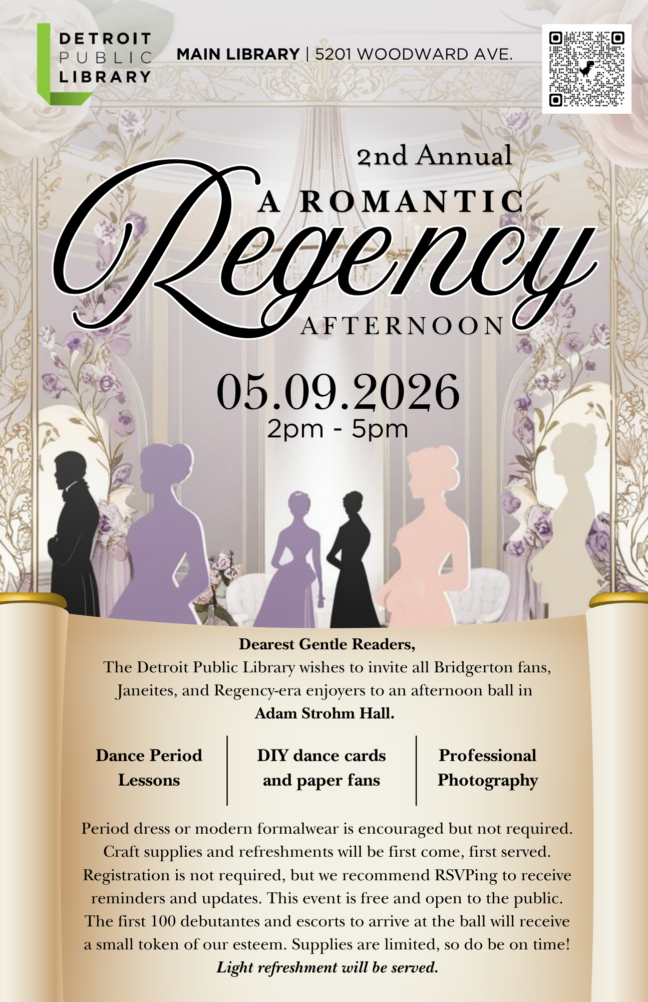 Dearest Gentle Readers, The Detroit Public Library (main branch) wishes to invite all Bridgerton fans, Janeites, and Regency-era enjoyers to our SECOND Annual Romantic Regency Afternoon ball in our beautiful Adam Strohm Hall on Saturday, May 9th, 2026 at 2pm. Entertainment shall include: * A dance caller who will teach proper period dances * DIY dance cards and paper fans * Light refreshments * A photo booth with a photographer on site to commemorate your experience Period dress or modern formalwear is encouraged but not required! The first 100 debutantes and escorts to arrive at the ball will receive a small token of our esteem. Supplies are limited, so do be on time! Craft supplies and refreshments will be first come, first served. See the below link to this new event, which is where you can register. This event is free and open to the public! https://www.eventbrite.com/e/2nd-annual-romantic-regency-afternoon-tickets-1... Any questions, please contact one of the hosts at our emails below! Thank you to everyone who supported us last year, and we look forward to seeing you all at this year's event! Flyer is attached in case anyone wants to print and share! * Jessica Bostian; jbostian@detroitpubliclibrary.org * Jennifer Noble; jnoble@detroitpubliclibrary.org Jessica Bostian Assistant Manager Social Science, Education, Religion Business, Science, Technology Detroit Public Library 5201 Woodward Ave. Detroit, MI 48202 Patent and Trademark Resource Center Representative jbostian@detroitpubliclibrary.org 313-481-1403