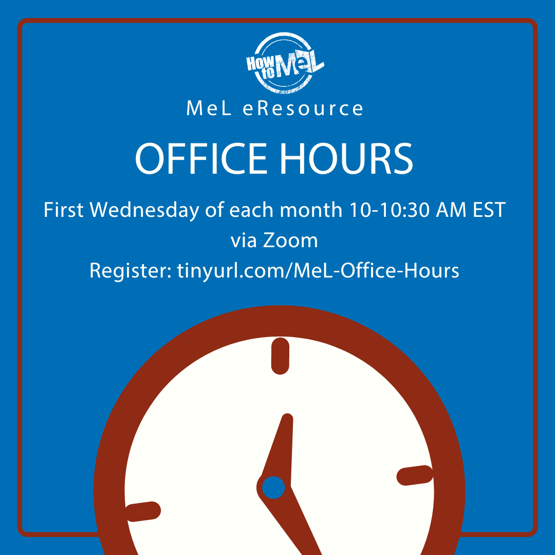 Good Afternoon Everyone! MeL eResource office hours continue on a new schedule. Join us the first Wednesday of each month to learn more about using the MeL eResources. Come prepared to ask questions, share how you are using MeL in your library, and engage with other MeL eResource users from Michigan libraries. Register here<https://us02web.zoom.us/meeting/register/tZAkfumgrjgrGtPEf8azqonaEiOhX0dcc-1u#/registration> to attend. Hope to see you there starting February 5, 2025! [cid:image001.png@01DB73E3.52CF2840] This project was made possible in part by the Institute of Museum and Library Services through the Library of Michigan. Have a great weekend! Laura Laura Warren-Gross MeL Engagement Specialist for Public Libraries Midwest Collaborative for Library Services 517-481-2022 warren-grossl@mcls.org [cid:image002.png@01DB73E3.52CF2840] mcls.org<https://www.mcls.org/> | Facebook<https://www.facebook.com/mcls.org> | X<https://twitter.com/mclsorg> | LinkedIn<https://www.linkedin.com/company/midwest-collaborative-for-library-services> [cid:image003.png@01DB73E3.52CF2840]