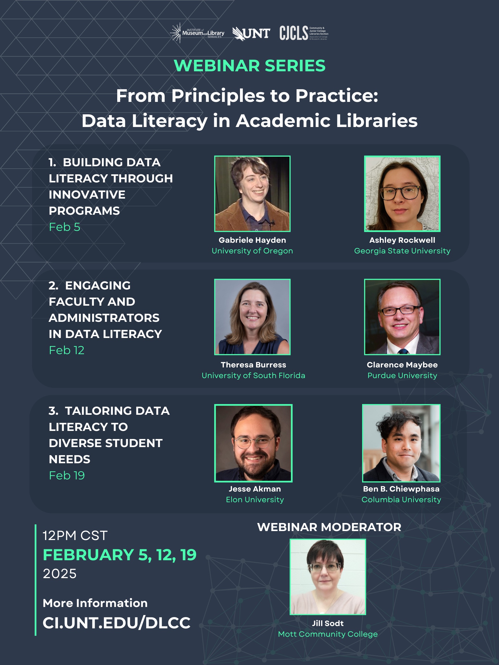 Hello, If you are an academic librarian or have an interest in data literacy, I encourage you to register for the upcoming webinar series: From Principles to Practice: Data Literacy in Academic Libraries. For more information or to register: https://ci.unt.edu/dlcc/webinars/webinar-registration.html [image: EntireWebinar_Poster.png] Jill M. Sodt Director of Library Services, Mott Library Chair ACRL Community and Junior Colleges Libraries Section President Friends of Michigan Libraries Chair Michigan Academic Libraries Association Community College Libraries Interest Group ML2017 810-762-0415 *My work day may look different than your work day. Please do not feel obligated to respond outside your normal working hours.*