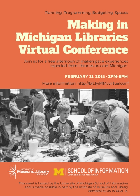 Hi, All: *Schedule and Registration are up at* *http://imlsmaking.sites.uofmhosting.net/conference/* <http://imlsmaking.sites.uofmhosting.net/conference/> On February 21st from 2pm-6pm, the University of Michigan School of Information will hold an online Virtual Conference of live webinars presented by practicing public librarians from around the state on the topics of planning, budgeting, implementing, and programming around makerspaces in Michigan libraries. Please plan to attend online! This event was made possible in part by the Institute of Museum and Library Services RE-05-15-0021-15 Please email Ben Rearick at brearick@umich.edu with any questions!