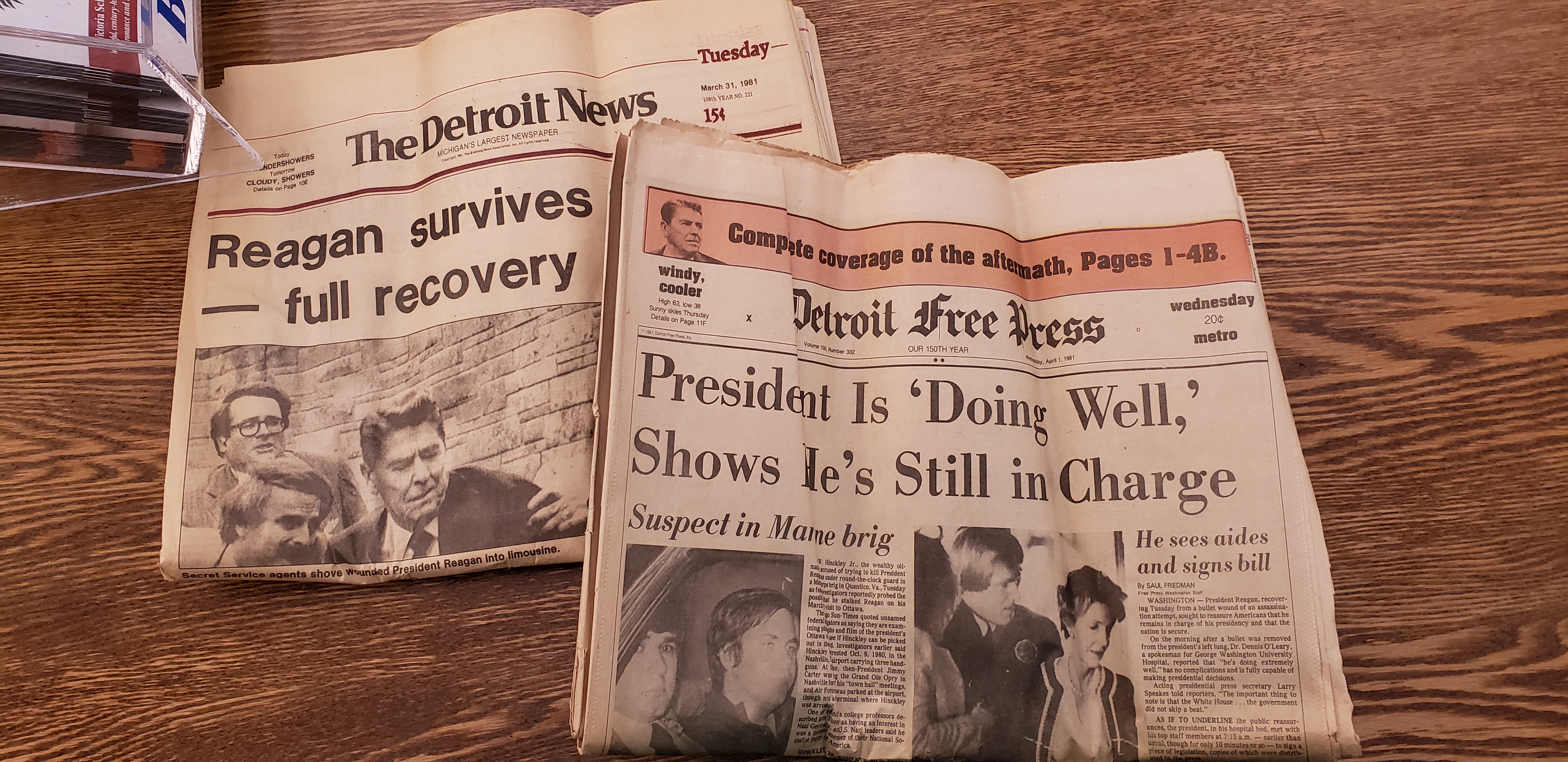 Hey Everyone, I had someone for our community donate two old newspapers to our library. We can't use them and neither can our local historical society. Is there anyone who would like them? I can send them in RIDES delivery... They are the Detroit Free Press from Wednesday, April 1, 1981 and the Detroit News from March 31, 1981 and seem to center around an assassination attempt of President Reagon. They are yellowed and have fold marks in them because it looks like they were stored in the original delivery bag folded in thirds but otherwise are in good condition. I have attached a picture of them below. Let me know if anyone wants them. Thanks, Janelle Janelle (Martin) Bishop Head of Fiction Marguerite deAngeli Library Lapeer District Library 921 W. Nepessing St. Lapeer, MI 48446 jmartin@lib.lapeer.org 810-664-6971 ext 3218