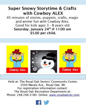 If anyone needs a fun & INEXPENSIVE program, Cowboy ALEX is available to come to your library & put on the "Cowboy ALEX Storytime and Crafts" program. Cowboy ALEX Storytime and Crafts is 45 minutes of stories, crafts, puppets, magic and fun. Good for kids 3 - 8 years old. All types of themes are available. See attached flyers and my Facebook page for more info. & photos Thanks. Cowboy ALEX Phone: 248-224-6816 Facebook: www.facebook.com/cowboyalexstorytime Meetup: www.meetup.com/StorytimePlaydate/ Twitter: @ CowboyALEX1 <https://twitter.com/CowboyALEX1> <https://twitter.com/CowboyALEX1>