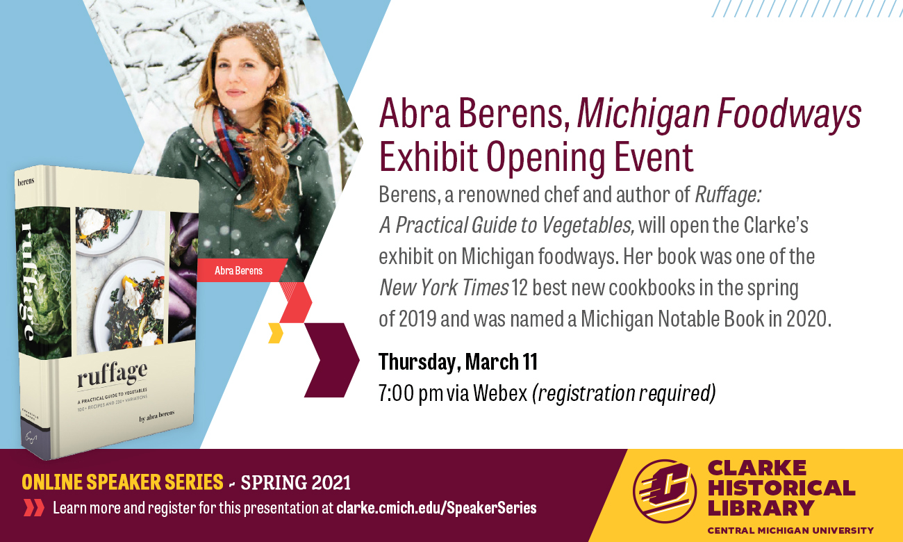 On Thursday, March 11, at 7:00 pm, the Clarke Historical Library will welcome renowned chef, local food advocate, and best-selling cookbook author Abra Berens to speak about food and drink and what they mean to the people of Michigan. Berens' book Ruffage: A Practical Guide to Vegetables was named one of the twelve best new cookbooks by the New York Times in 2019 and was a 2020 Michigan Notable Book. This talk opens the Clarke's newest exhibition, Michigan Foodways: Exploring History through Memories of Food. This presentation is free and open to the public. The event will be broadcast via Central Michigan University's videoconferencing tool, Webex, and it will be recorded to enjoy at a later time. Registration is required for the event and the shortened link to register is: https://is.gd/ClarkeAbraBerens Feel free to share this information far and wide! The Clarke is happy to answer any questions that anyone may have-please contact Bryan Whitledge (whitl1br@cmich.edu<mailto:whitl1br@cmich.edu>). Have a great day, Bryan Whitledge Archivist for University Digital Records Clarke Historical Library Central Michigan University 989-774-2159 whitl1br@cmich.edu