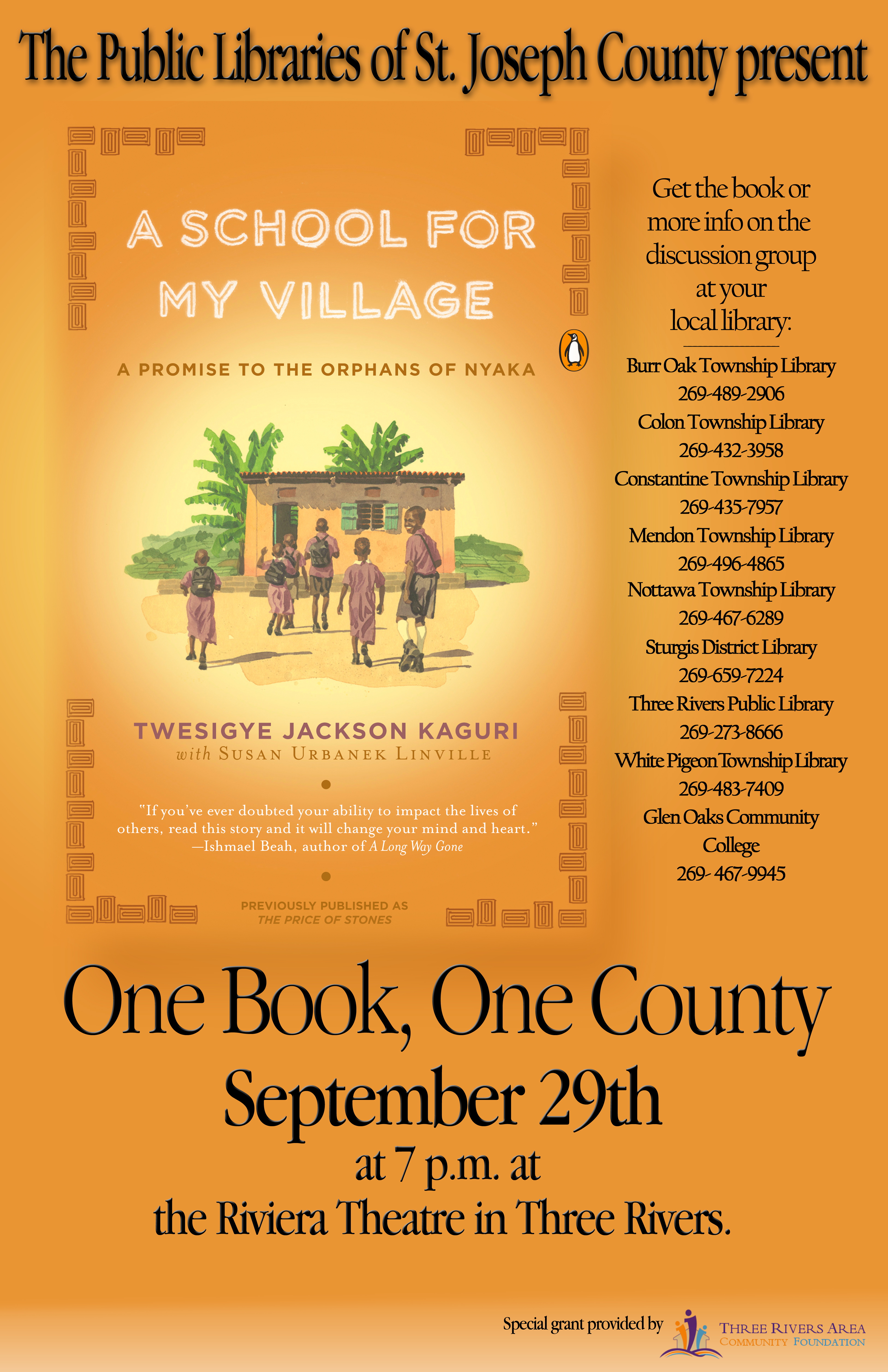 Please pass this on to your patrons. (poster attached) The libraries of St. Joseph County will be hosting Twesigye Jackson Kaguri, co-author of A School for My Village, for our One Book, One County event. The program will be held Tuesday, September 29th at 7 p.m. at the Riviera Theatre in downtown Three Rivers. Perri Saunders, Director White Pigeon Township Library 102 N. Kalamazoo St., P.O. Box 399 White Pigeon, MI 49099 Phone 269.483.7409 Fax 269.483.9923 perri@monroe.lib.mi.us<mailto:perri@monroe.lib.mi.us> Brighten the corner where you are.