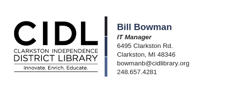 We charge nothing for scanning and emailing, we have a self-service system for that. We charge for faxing, copying, and printing. Those are to cover the cost of paper, toner and faxing costs. [Bill] From: michlib-l-bounces@mcls.org [mailto:michlib-l-bounces@mcls.org] On Behalf Of Howe Memorial via Michlib-l Sent: Tuesday, July 16, 2019 12:18 PM To: Michlib-l@mail2.mcls.org Subject: [Michlib-l] scanning and emailing Good afternoon all; Just wonder if libraries are doing scanning and emailing for patrons, and if you are are you charging? Thanks Sandy Johnson Howe Memorial Library 128 E. Saginaw St. Breckenridge, Mi. 48615 989-842-3202