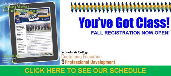 Are you responsible for creating flyers or other promotional material for your organization? Explore the basic principles of graphic design and several free, web-based tools that will have you looking like a pro. CES2 6256 Web Based Graphic Design Section 940061 begins Wednesday, December 2nd at 6:00pm. Get more information at http://www.schoolcraft.edu/continuing-ed/cepd/cepd-course-details/CES2-6256 Michele Fuher, Programming Coordinator Schoolcraft College | Continuing Education & Professional Development 18600 Haggerty Road Livonia, MI 48152-2696 Phone: 734.462.4584 | E-mail: mfuher@schoolcraft.edu<mailto:mfuher@schoolcraft.edu> www.schoolcraft.edu/cepd [facebook icon] Like us on Facebook <https://www.facebook.com/schoolcraftcepd> [twitter icon] Follow us on Twitter<https://twitter.com/SchoolcraftCEPD> [Fall 2015 Schedule - July 2015b]<http://www.schoolcraft.edu/docs/default-source/cepd/cepd-fall-schedule84062075d974670899b4ff00006e87b1.pdf?sfvrsn=2>