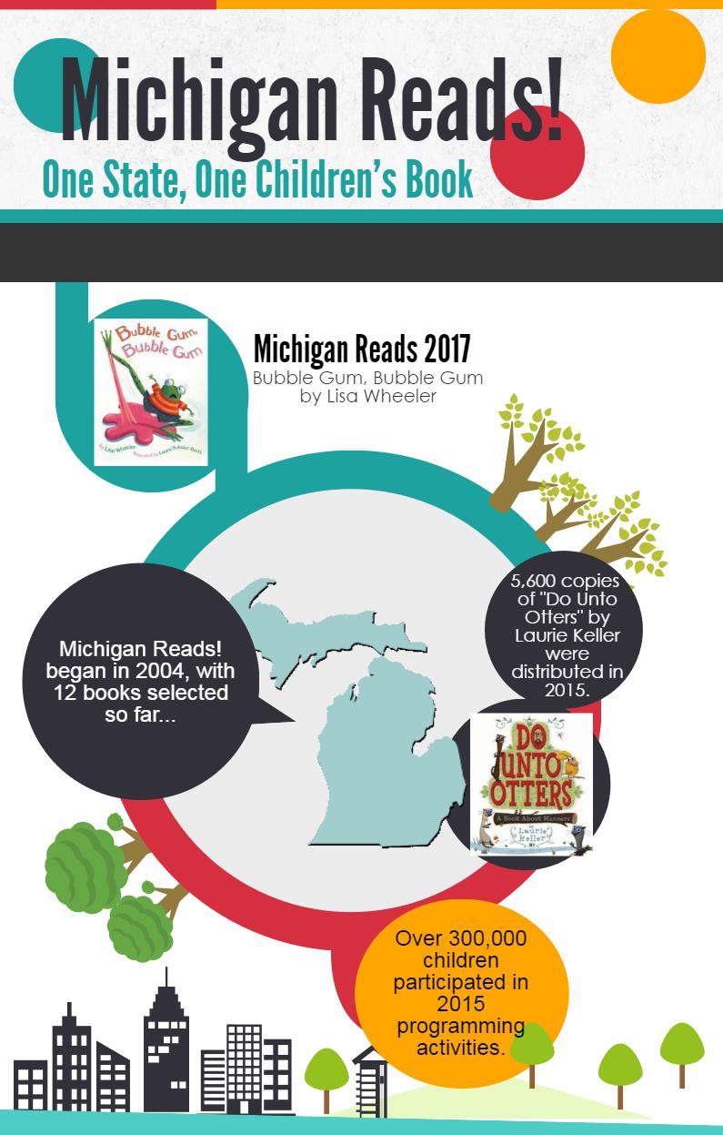 Lisa Wheeler's "Bubble Gum, Bubble Gum" selected for 2017 Michigan Reads! [cid:image001.jpg@01D1D2CD.B7E8F000] [Michigan Reads!]The Library of Michigan has selected Bubble Gum, Bubble Gum written by Lisa Wheeler<http://lisawheelerbooks.com/home.html> and illustrated by Laura Huliska-Beith for the March 2017 One State, One Children's Book program. What happens when Toad gets stuck in the Bubble Gum melting in the road? Join Toad & friends in this sticky, rhyming adventure and see what happens when they work together to get out of the mess! Stay tuned for a survey to request an author visit, which will be posted in September 2016, and delivery of the materials in Winter 2017. Thank you, Cathy Lancaster Youth Services Coordinator Library of Michigan 517-335-8129 517-373-5700 f LancasterC5@michigan.gov<mailto:LancasterC5@michigan.gov>