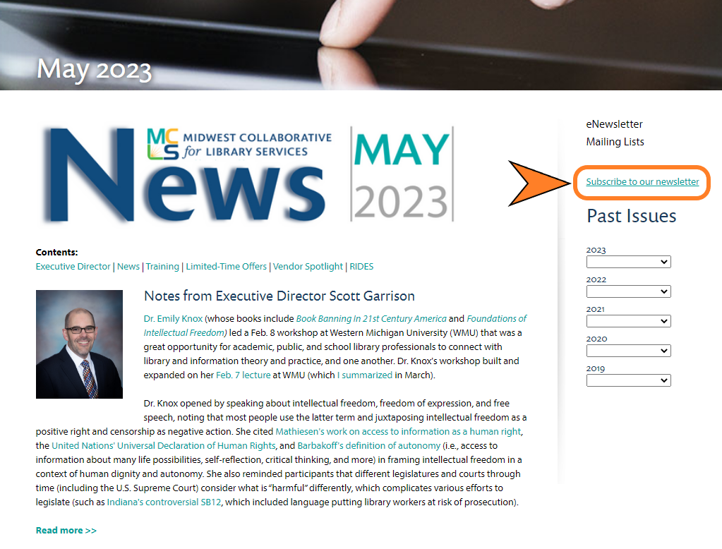Have you read MCLS's May newsletter? Find it at the link below and don't forget to subscribe to receive our monthly news in your inbox. https://www.mcls.org/news/enewsletter/may-2023/ [cid:052dee0b-4a13-4e00-b8ff-212e9039f895]<https://www.mcls.org/news/enewsletter/may-2023/> Mary Ruthko (she/her) Marketing and Communication Coordinator Midwest Collaborative for Library Services 517-507-4149 ruthkom@mcls.org<mailto:ruthkom@mcls.org> [cid:dae929db-6b8f-437e-9c6e-42166024957f] mcls.org<https://www.mcls.org/> | Facebook<https://www.facebook.com/mcls.org> | Twitter<https://twitter.com/mclsorg> | LinkedIn<https://www.linkedin.com/company/midwest-collaborative-for-library-services>