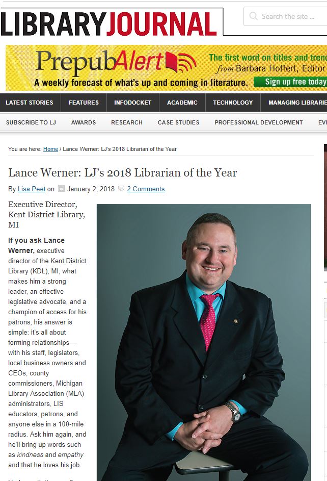 Lance, you make all of us look good!! Congratulations!! *Donna Olson, Director* *Salem-South Lyon District Library* 9800 Pontiac Trail, South Lyon, MI 48178 Phone: (248) 437-6431 ext. 206 | Fax: (248) 437-6593 http://www.ssldl.info | https://www.facebook.com/SSLDL https://www.instagram.com/ssldl | https://twitter.com/ssldl