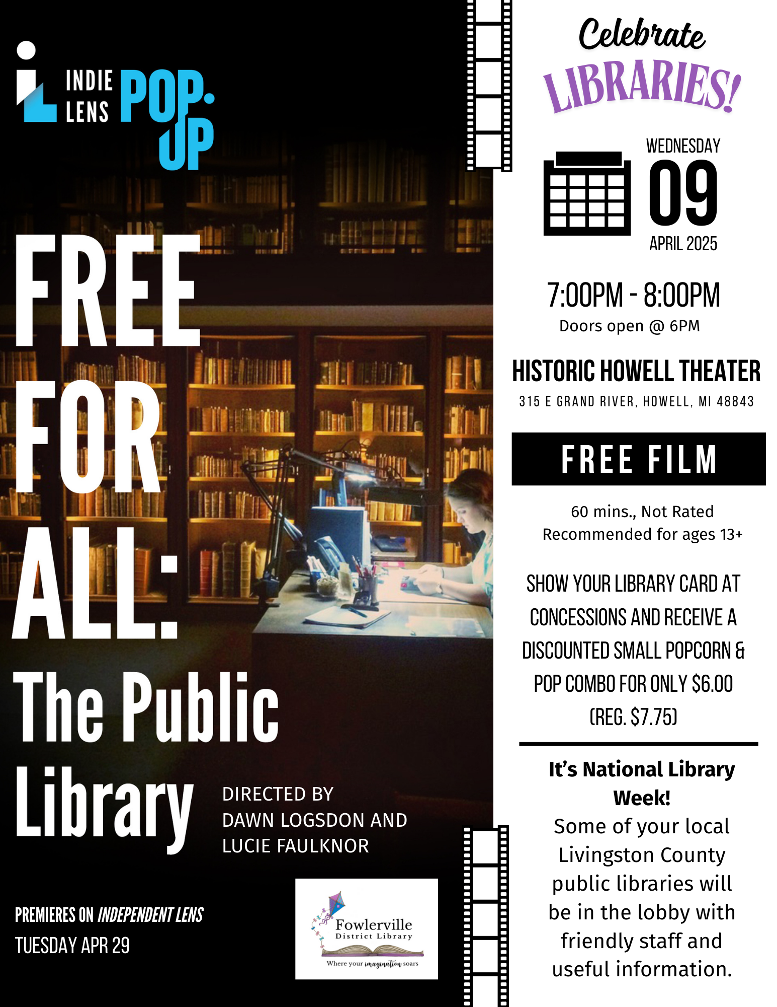 Hello everyone, I hope you are making plans to come to our National Library Week special film screening of @IndpendentLens' FREE FOR ALL: THE PUBLIC LIBRARY @ 7 pm on Wednesday, April 9 @ the Howell Historic Theater in Howell. Doors open at 6 pm. We need each other right now. Come and enjoy a terrific film and wallow in the company of fellow librarians. A flyer is attached for your fridge and for sharing widely. Hope to see you there! Isabella Rowan, MLIS Library Director Phone: 517-223-9089, Ext. 111 130 S. Grand Ave. Fowlerville, MI 48836 https://www.fowlervillelibrary.net/ [cid:ae6db552-914d-49b7-abe2-83a14994ed77] This message is intended only for the use of the individual or entity to which it is addressed, and may contain information that is privileged, confidential, and/or exempt from disclosure under applicable laws. If the reader of the message is not the intended recipient, or the employee or agent responsible for delivering the message to the intended recipient, you are hereby notified that any dissemination, distribution or copying of this communication is strictly prohibited. If you have received this communication in error, please notify us immediately by telephone and/or reply to this e-mail message. Thank you.