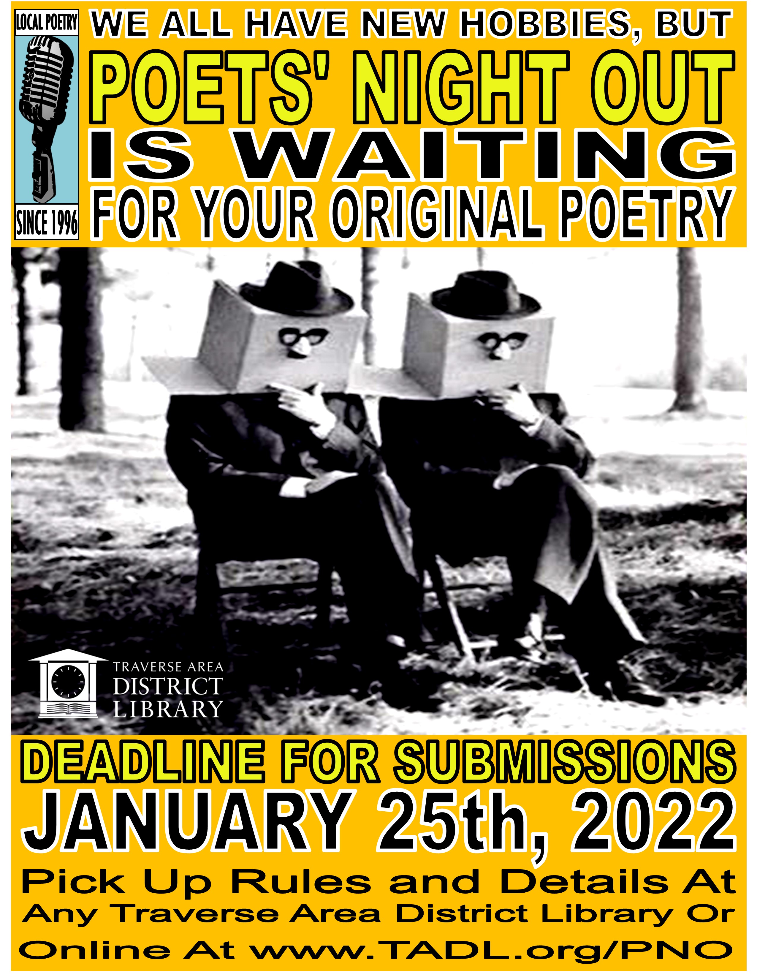 Poets of all ages are invited to enter their original poetry in the Poets’ Night Out contest of the Traverse Area District Library. Do you or do you know someone who may be interested and live in, own property in, or attend school in Alcona, Antrim, Benzie, Charlevoix, Cheboygan, Emmet, Grand Traverse, Kalkaska, Leelanau, Manistee, Missaukee, Montmorency, Oscoda, Otsego, Presque Isle, or Wexford counties? If so, enter by January 25, 2022. Everything you need to know is listed here: https://www.poetsnightout.org/2021/poets-night-out-is-waiting-for-your-origi... Let us know if you have any questions. There are even submissions for students so tell your teacher friends, too! -- *Betsy Myers* Reference Department Interlibrary Loan/Programming *Traverse Area District Library* 610 Woodmere Ave Traverse City, MI 49686 231 932-8502 *Currently listening to Local Woman Missing by Mary Kubica and Presidents Daughter by Bill Clinton and James Patterson*