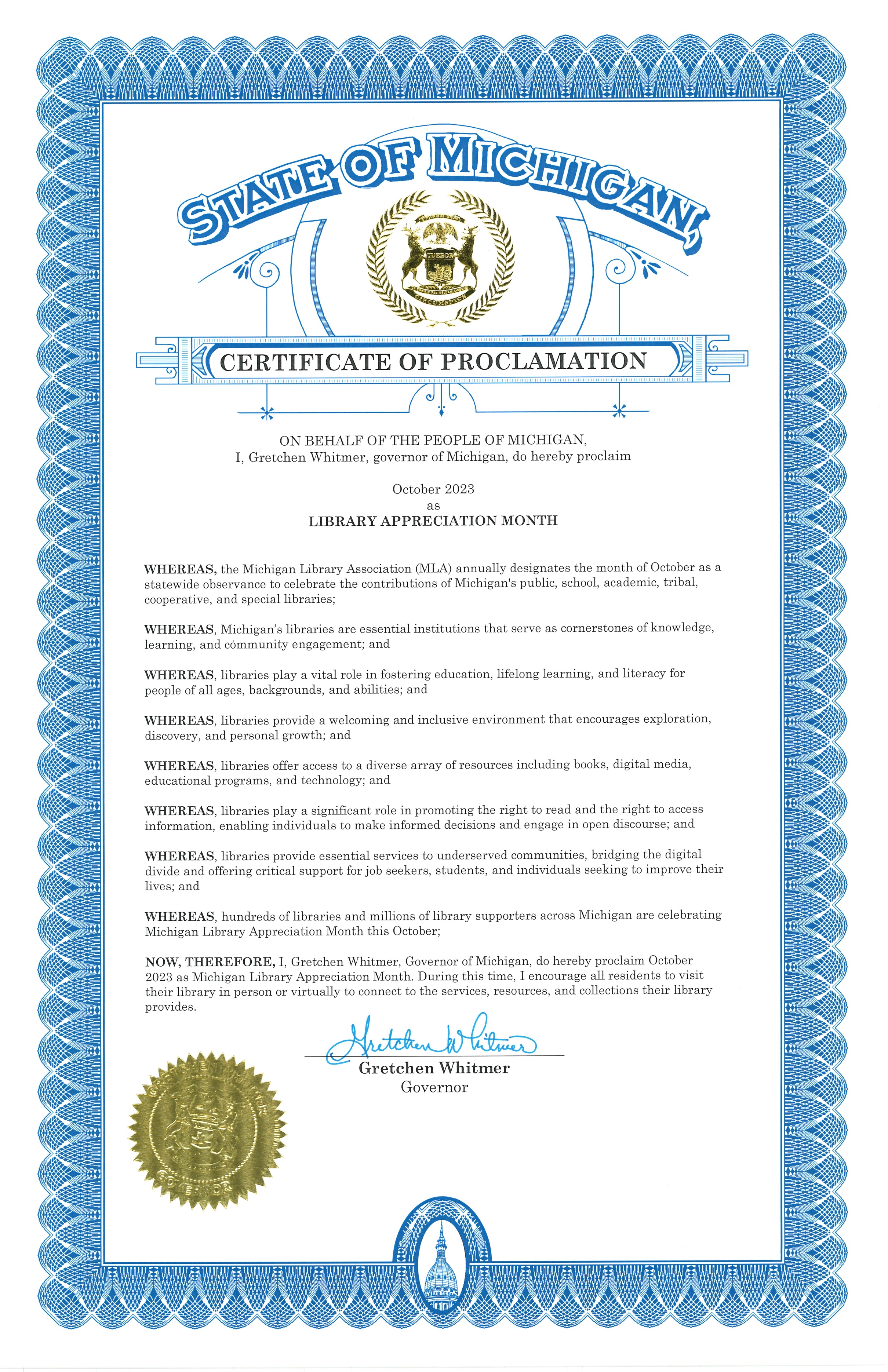 It's official! Governor Gretchen Whitmer has declared October as Michigan Library Appreciation Month! …WHEREAS, hundreds of libraries and millions of library supporters across Michigan are celebrating Michigan Library Appreciation Month this October; NOW, THEREFORE, I, Gretchen Whitmer, Governor of Michigan, do hereby proclaim October 2023 as Michigan Library Appreciation Month. During this time, I encourage all residents to visit their library in person or virtually to connect to the services, resources, and collections their library provides. Check out the proclamation here<https://www.michigan.gov/whitmer/news/proclamations/2023/10/01/october-2023-michigan-library-appreciation-month> and join us in celebrating Michigan libraries, librarians, and library workers all October long! [A certificate of proclamation with a seal Description automatically generated] [cidimage002.png@01D73C4D.ABEAD040] Rachel Ash Membership and Communications Director Michigan Library Association Phone: (517) 394-2774 ext. 2 Direct: (517) 881-6652 milibraries.org rfash@milibraries.org<mailto:%0bmilibraries.org%0brfash@milibraries.org> Follow MLA on Facebook<https://www.facebook.com/MichiganLibraryAssociation> and Twitter<https://twitter.com/mlaoffice>!