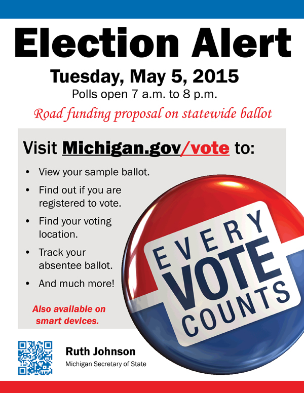 REMINDER If you have not done so already, please consider posting the attached "Election Alert" flyer or uploading it onto your website to alert patrons about the May 5 election. As always, any help you can provide is greatly appreciated. Cathleen P. Simlar Communications Specialist, Executive Office Michigan Department of State Office: (517) 373-9080 Cell: (248) 761-7145 Email: Simlarc@michigan.gov<mailto:Simlarc@michigan.gov> Join My Professional network on LinkedIn<blocked::http://www.linkedin.com/pub/cathleen-simlar/18/798/235> [Description: Description: Description: SOS logo small] <http://www.michigan.gov/sos> STAY CONNECTED: [Description: Description: Description: Facebook logo]<http://www.facebook.com/MichiganSoS> [Description: Description: Description: Twitter logo] <https://twitter.com/michsos> [Description: Description: Description: YouTube logo] <http://www.youtube.com/michsosoffice> [Description: Description: Description: GovDelivery logo] <https://public.govdelivery.com/accounts/MISOS/subscriber/new>