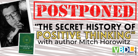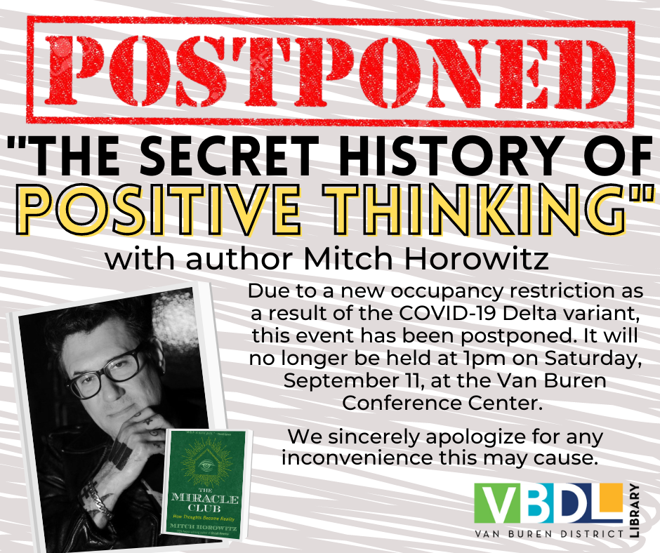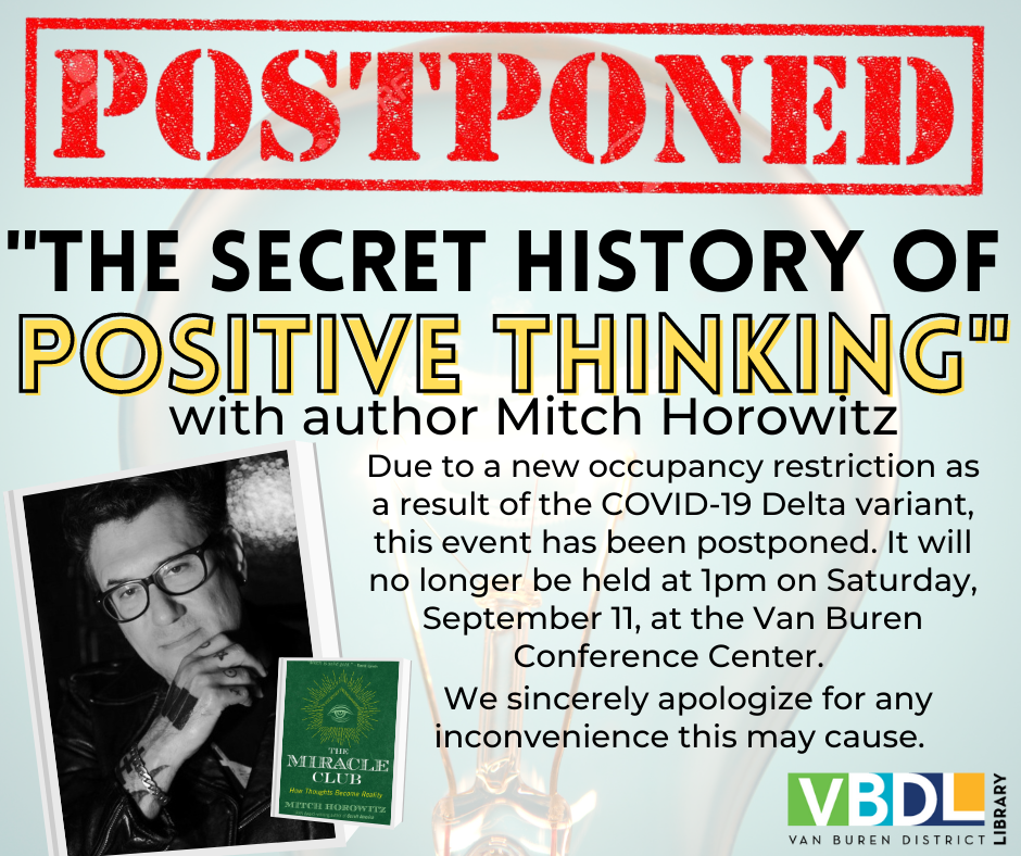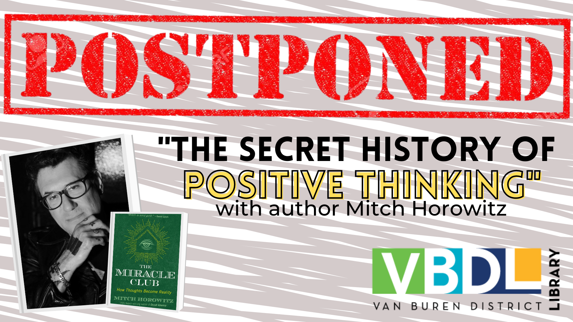 Hi again,After thinking about it, we decided our original literature stating that the Mitch Horowitz author visit, originally scheduled for September 11 at the Van Buren Conference Center was cancelled was inaccurate as we will definitely be rescheduling Mitch for a later date. Please find an updated PDF flier and online graphics more accurately reflecting that this event is postponed attached. Feel free to contact me with any questions email: dhutchins@vbdl.org or phone 269-423-4771. Dan Hutchins Director Van Buren District Library 200 North Phelps Street Decatur, MI 49045 dhutchins@vbdl.org http://www.vbdl.org 269-423-4771