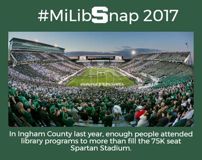 Greetings, The Library of Michigan would like to announce the second all-state library advocacy campaign known as Library Snapshot Day to take place May 22-26, 2017 with the hashtag #MiLibSnap. You can use it in all your social media venues. You may remember #MiLibSnap from last year. This is a national ALA initiative of library advocacy based on data. This year we have a slight twist. It's still about advocacy and it's still about data but we encourage you to take library numbers and compare them to figures of other activities in your community. Does your community plant a lot of flowers or trees? Drink (or make) a lot of beer or wine? Attend a lot of sporting events? Gather numbers for how many and compare them to library data such as door counts or program attendance or circulation that show your library is engaged with your community. Need library numbers? The numbers you provide in your state aid report are a great place to start. If you're looking for a broader, state-wide library number, feel free to contact Library Data Coordinator Joe Hamlin at hamlinj2@michigan.gov. Need community numbers? Try State of Michigan websites, your local chamber of commerce, or local research agencies such as colleges, universities or extension offices. Get creative! Here are a couple of examples, feel free to borrow them: [NBA #MiLibSnap 2017 NFL Michiganders checked out 1.5 times more materials than the total number of NBA, NFL & NHL ticket sales in North America.] [#MiLibSnap 2017 In Ingham County last year, enough people attended library programs to more than fill the 75K seat Spartan Stadium.] Consider using action verbs in your posts such as: Serve, Answer, Engage, Link, Entertain, Teach, and Create. As you ready your comparisons, think about the distinct value that you provide better than anyone else in your community. Consider how your library is: * An excellent return on investment * Supports strong economic development and impact * Provides great employment support * Delivers provable early literacy development * Serves your community with ongoing lifelong support for formal education and homework help * Provides affordable access to community resources * Serves the whole community equitably * Supports cultural vitality * Is a recognized and valued leisure activity for a majority of Michiganders There are lots of free tools to help you with the graphics, from simple to sophisticated. Check out the list below for creating great visuals. Word cloud tools: * Wordle<http://www.wordle.net/> * Tagul<https://tagul.com/> * Word It Out<https://worditout.com/> * PowerPoint add-in Infographic tools: * Piktochart<http://piktochart.com/> * Venngage<https://venngage.com/> * Easel.ly<http://www.easel.ly/> Data visualization tools: * Gapminder<http://www.gapminder.org/> * Tableau<https://public.tableau.com/s/> * Google Public Data<http://www.google.com/publicdata/directory> * Infogr.am<https://infogr.am/app/#/create> Sonya Schryer Norris Library of Michigan 702 W. Kalamazoo St. PO Box 30009 Lansing, MI 48909 517-373-4457 http://www.michigan.gov/libraryofmichigan http://www.mel.org<http://www.mel.org/> http://www.michlibrary.org<http://www.michlibrary.org/> [cid:image001.png@01D169A3.73327F50] Take time this month to check out the Essential Instructional Practices in Early Literacy<http://www.gomaisa.org/sites/default/files/K-3%20Literacy%20Essentials%203.2016.pdf#overlay-context=general-education-leadership-network>