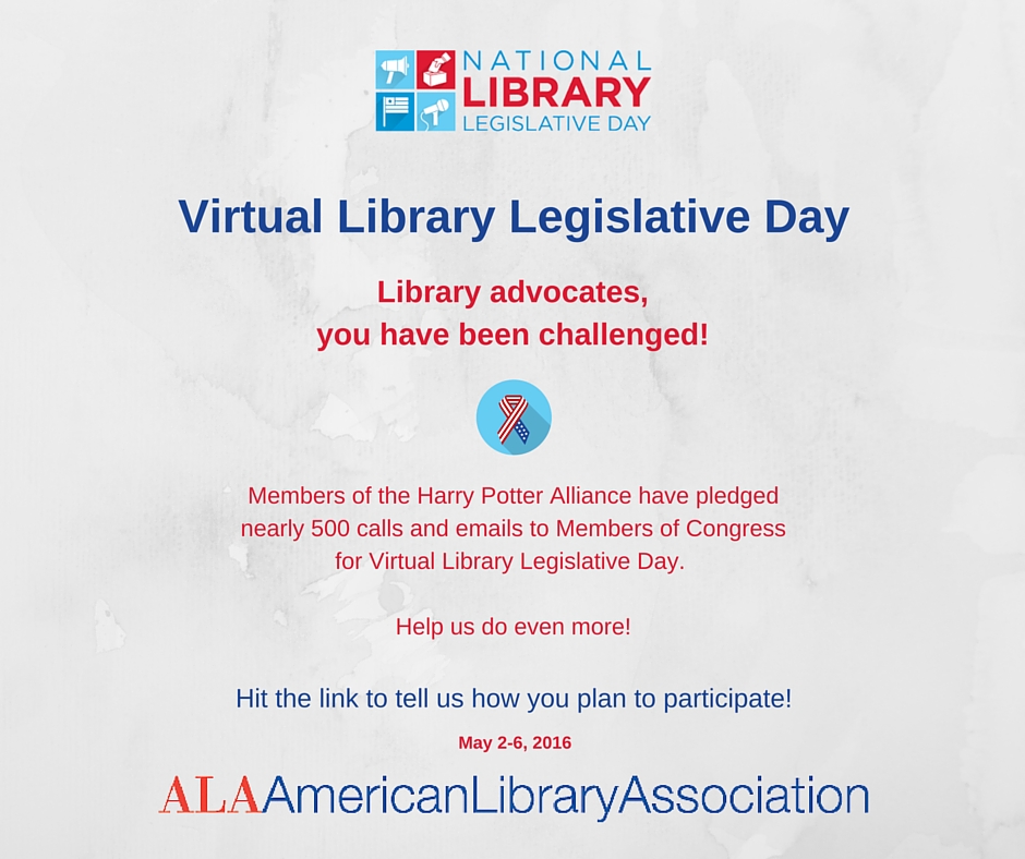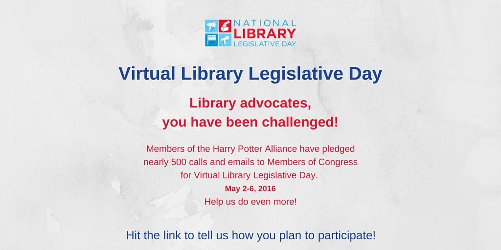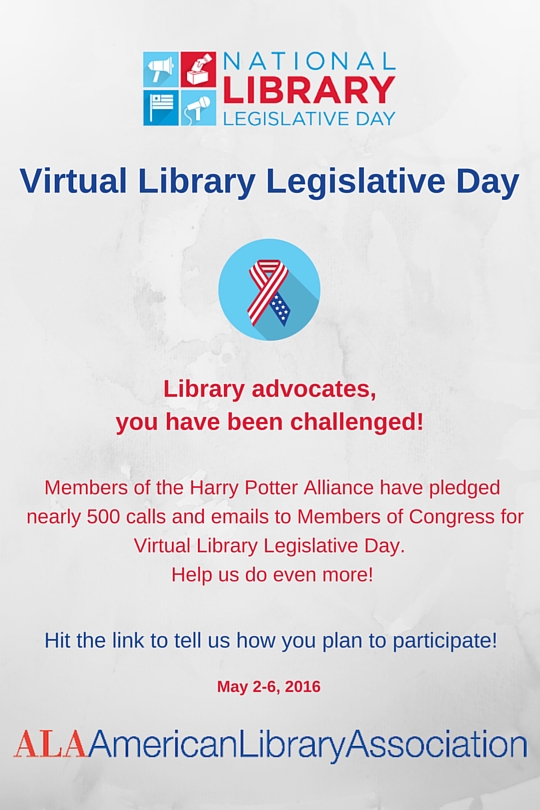 FYI ________________________________ From: alacro-l-request@lists.ala.org <alacro-l-request@lists.ala.org> on behalf of Emily Sheketoff <esheketoff@alawash.org> Sent: Thursday, April 14, 2016 12:46 PM To: alacro-l@lists.ala.org Subject: [alacro-l] Virtual Library Legislative Day As part of National Library Legislative Day 2016 (NLLD), we are offering library advocates unable to attend in person the chance to participate through Virtual Library Legislative Day (VLLD)! This year, we're teaming up with the Harry Potter Alliance (HPA) to help expand our efforts and take advantage of the momentum started by the nearly 400 library supporters who plan to attend NLLD. Their Chapters' members are pledging their time to make calls, send emails, tweet, and otherwise raise awareness about library issues during the week of May 2nd. To date, the HPA has received pledges for nearly 500 actions from their members! We think we can do our wizarding friends even better. Over the next few weeks, please ask everyone in your circles -- members, followers, patrons, fellow library staffers, and listservs -- to join us! Once they register<https://docs.google.com/forms/d/1rFgFBSNzL3l2vL40lq1UragqzUkxZN18G1MY0hDdt-4/viewform> for VLLD, we'll follow up by sending them talking points and other handy resources they can use to advocate easily and effectively. We'll be including a link to a webstream of the National Library Legislative day program, live from Washington, on the morning of May 2nd. They'll get to hear our keynote speaker, former Congressman Rush Holt, and listen in on this year's issue briefing. I've attached a few graphics that I'll be using to promote VLLD on social media this year. There's also a handy resource toolkit for librarians<https://drive.google.com/file/d/0BzUCAywi1eQDSW9laWJkNUlSSDZaY3oxM013X3hSTjJMZlhj/view> who may want to get younger advocates involved. Please feel free to use them as you like! You can also find out more by visiting the United for Libraries<http://www.ala.org/united/advocacy/virtuallegday> and the Harry Potter Alliance<http://www.thehpalliance.org/national_library_legislative_day> webpages, or by subscribing to the Action Center<http://t.umblr.com/redirect?z=http%3A%2F%2Fcqrcengage.com%2Fala%2Fhome&t=NDMwOTFhZGJiZTVlMGVkYmM5ZDllMjYzZWZlZTg0YTYwN2NjOWU3OSxUN0x5QkxRaw%3D%3D>. Please feel free to contact Lisa Lindle, Grassroots Communications Specialist for ALA Washington, if you have any questions.