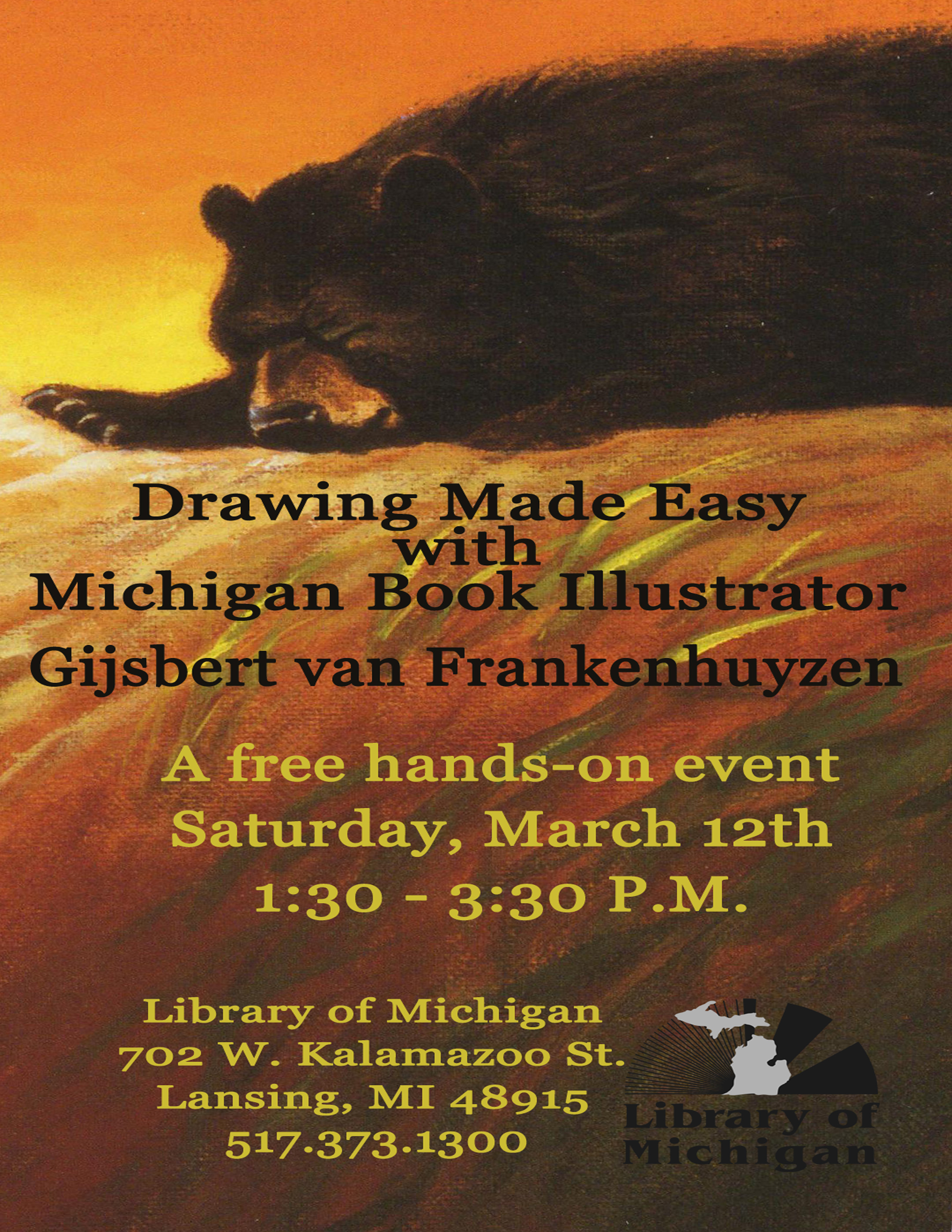 Drawing Made Easy with Michigan Book Illustrator Gijsbert “Nick” van Frankenhuyzen A free hands-on event at the Library of Michigan Geared towards children (but adults may join in) Gijsbert takes the group through a step by step process using circles, squares and triangles showing how easy it is to draw. Everyone goes home with 3 – 4 drawings and a real sense of accomplishment in their artist skills. Mr. van Frankenhuyzen has illustrated over 25 books the latest being, S is for Sleeping Bear Dunes by Kathy-jo Wargin, Sleeping Bear Press, 2015 [cid:image004.png@01D15DBF.1BA945B0]March 12, 2016, 1:30 – 3:30, Lake Michigan Room, 3rd floor Library of Michigan 702 W. Kalamazoo St. Lansing, MI 48915 517.373.1300 Edwina A. Murphy Michigan Collection Librarian Michigan Center for the Book Library of Michigan 702 West Kalamazoo St. Lansing, MI 48909 www.facebook.com/MichiganCenterfortheBook<http://www.facebook.com/MichiganCenterfortheBook> www.facebook.com/libraryofmichigan<http://www.facebook.com/libraryofmichigan>