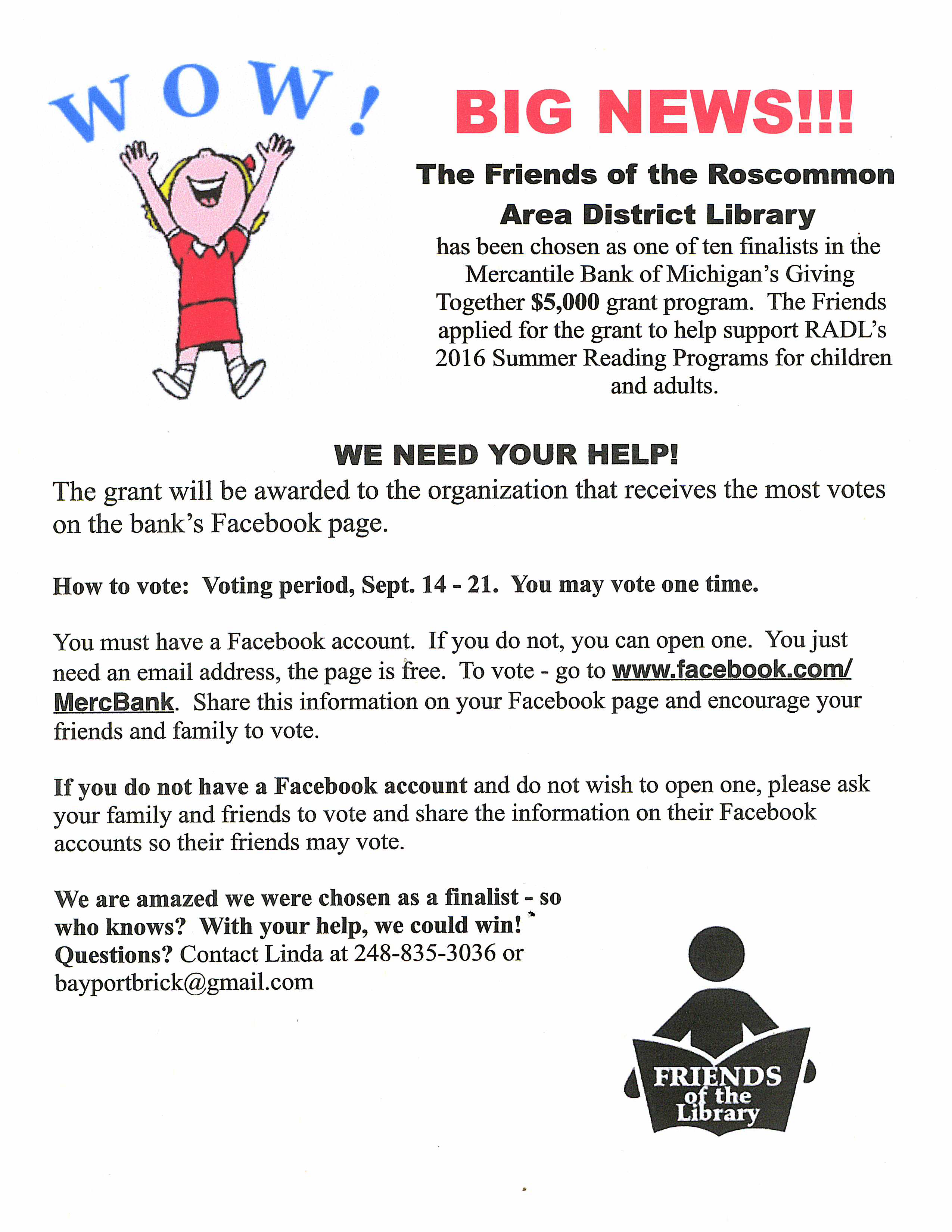 WE NEED YOU! The Friends of the Roscommon Library need everyone's help! We have been chosen as one of ten finalists in the Mercantile Bank of Michigan's Giving Together $5,000 grant program. We applied for the grant to help support RADL's 2016 Summer Reading Program for children and adults. Voting period is Sept. 14-21. You may only vote one time. To vote-go to www.facebook.com/MercBank. Share this information on your Facebook page and encourage your friends and family to vote. Help our small rural library continue to provide a dynamic summer reading program to all!
