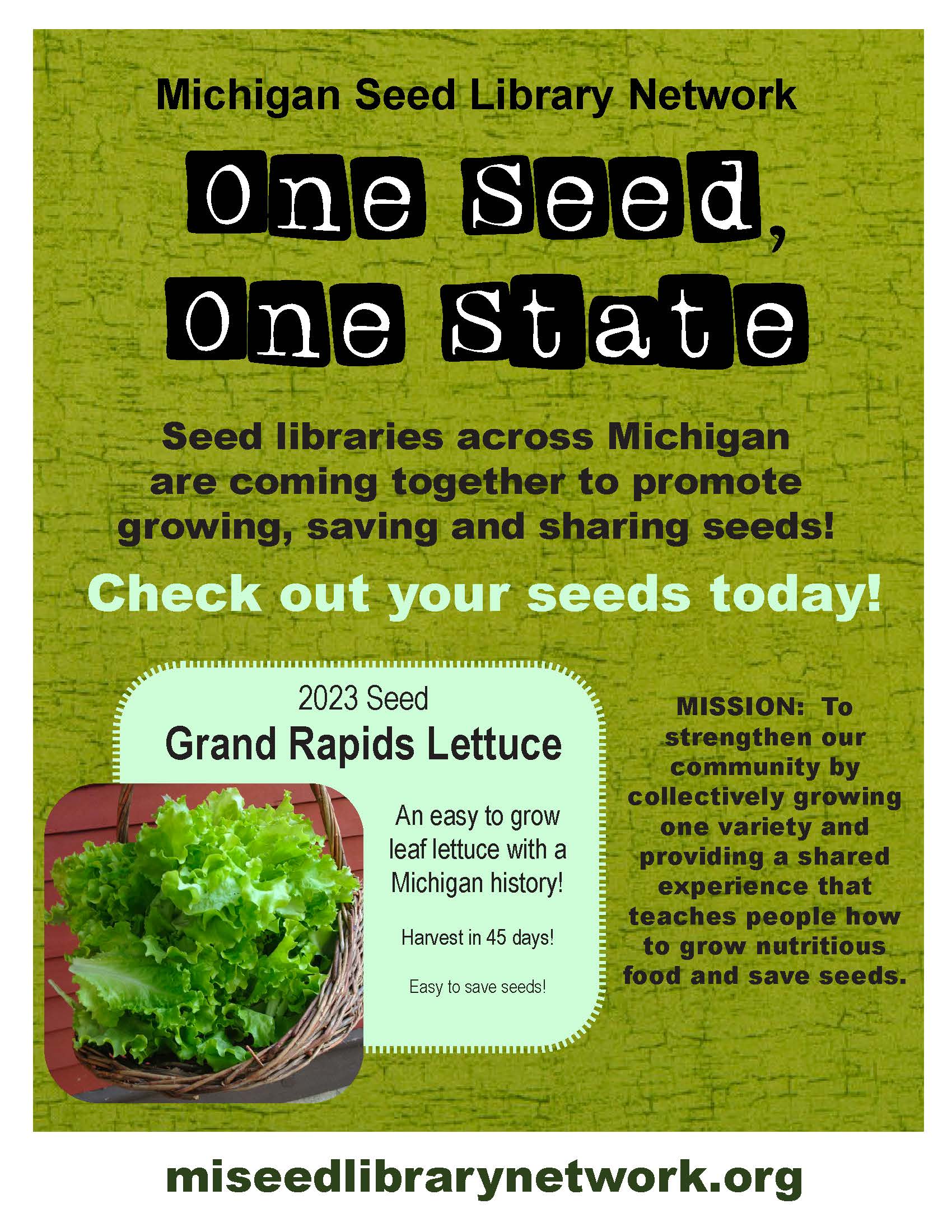 Hello! The MI Seed Library Network is happy to announce that registration is now open for the 2023 One Seed, One State initiative. Our selection this year is 'Grand Rapids' lettuce, a great garden plant with a Michigan Connection! Our apologies for cross-posting as we roll out this information to various listservs and mailing lists in an effort to reach all interested parties. As many of you know, the MI Seed Library Network operates entirely on donations. MSLN has plenty of seeds to distribute, but this year we are asking that participating seed libraries "donate" by printing out their own posters, brochures, seed packet labels, and make or purchase their own seed packets. We realize that not every seed library has the resources to do so, and there is an option on the registration form to request these items. We do not want anyone to feel like they can't participate because they do not have the items available - we will make sure you have what you need for a successful program. Files for the forms will be sent via email when the seeds are shipped to you.