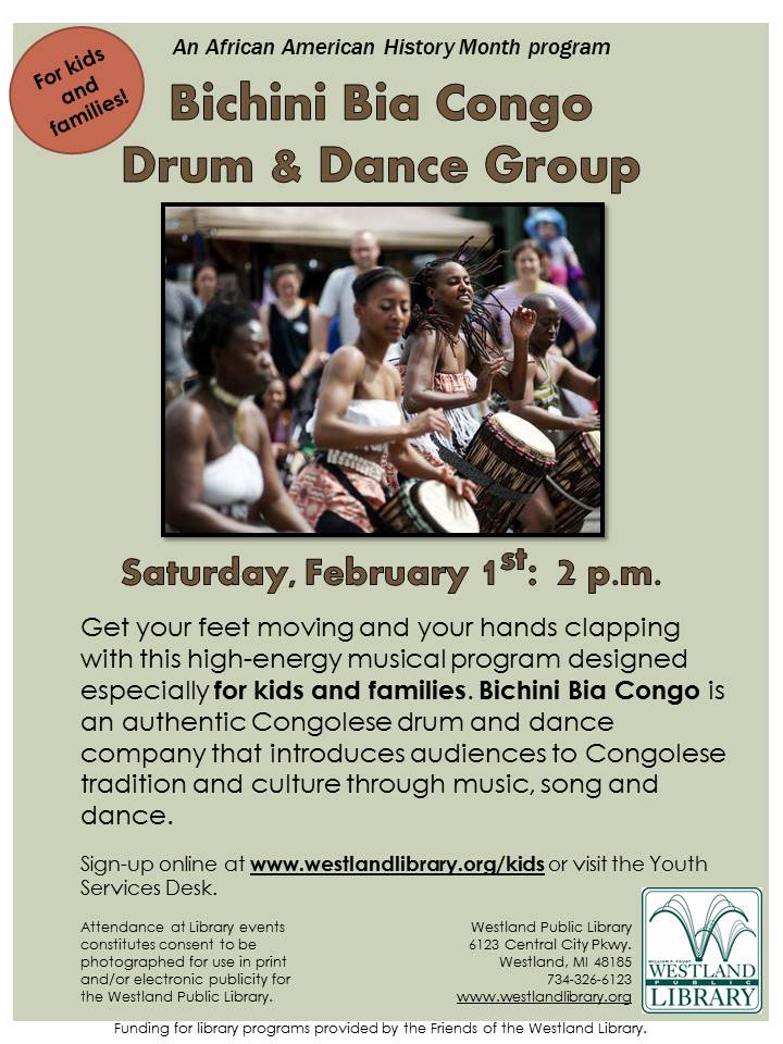 The Westland Public Library is proud to announce two family-oriented African American History programs during the month of February. February 1st: 2 p.m. Bichini Bia Congo Drum & Dance Group Get your feet moving and your hands clapping with this high-energy musical program designed especially for kids. Bichini Bia Congo (http://class-act.com/acts/bichinibiacongo/) is an authentic Congolese drum and dance company that introduces audiences to Congolese tradition and culture through music, song and dance to promote African cultural awareness and celebrate the connections between Africa and the world's people, culture and history. February 8th: 2 p.m. Rosie Chapman, The Spirit of Rosa Parks Rosie Chapman is not only a dynamic storyteller but also a mixed media artist, playwright, drama coach, and motivational speaker. As a storyteller, she has performed all over the USA, Australia, Africa, Scotland and Germany. Her presentation will be about Rosa Parks and the Civil Rights Movement. She will bring Parks to life and describe her importance as an African American civil rights activist, whom the U.S. Congress later called "the first lady of civil rights", and "the mother of the freedom movement". This is a family friendly event filled with audience participation. Ages 7-99 will enjoy this presentation! Please pass along to interested parties. Andy ------------ Andy Schuck Library Programming Westland Public Library 6123 Central City Parkway Westland, MI 48185 734-326-6123 www.westlandlibrary.org [sig-getyourgeekon]