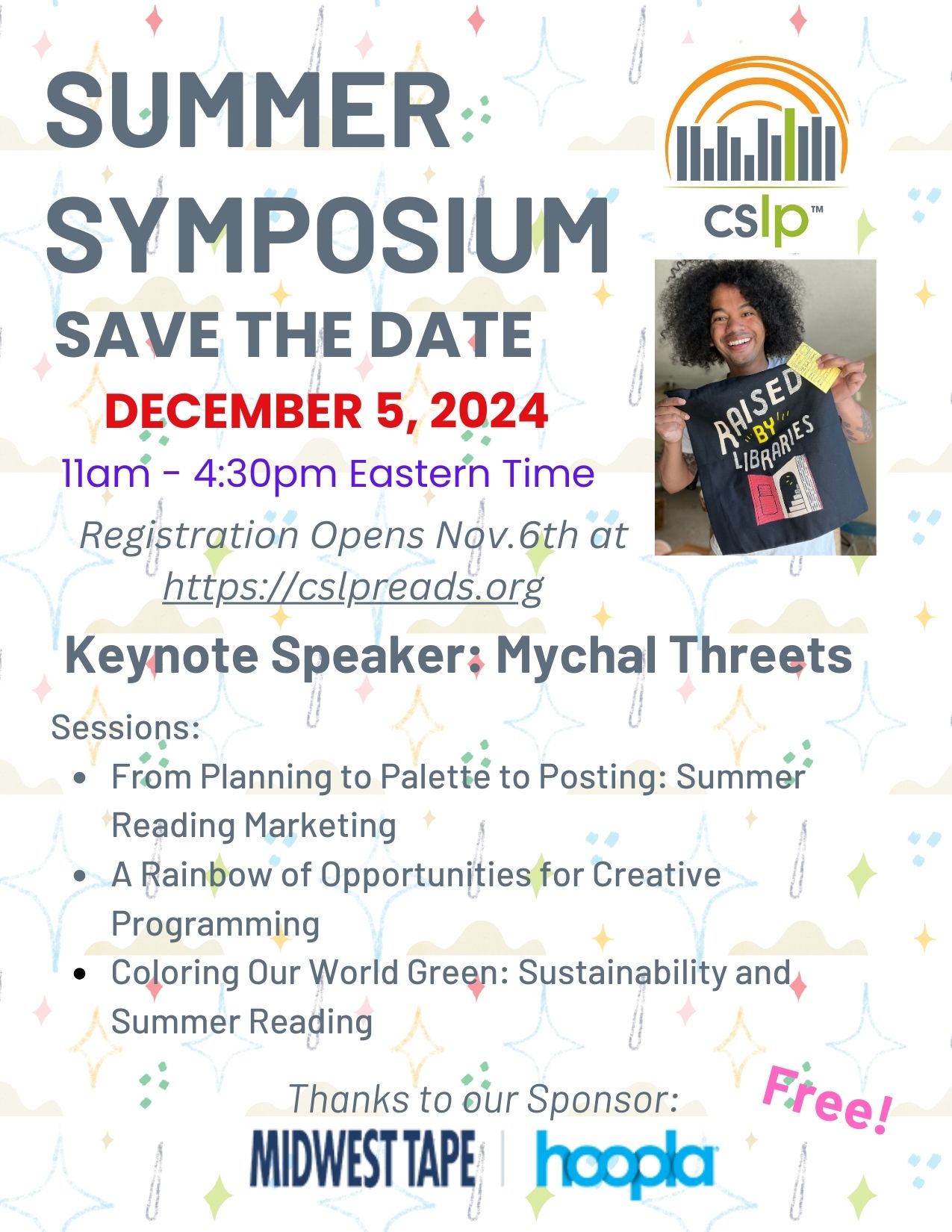 CSLP is pleased to announce the date of our Summer Symposium! Thursday, December 5th, 11:00 am - 4:30 pm ET! Registration opens November 6th. Go to www.CSLPreads.org<http://www.CSLPreads.org> for details. [cid:image001.jpg@01DB02CF.DE993530]