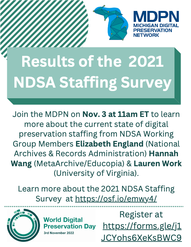 Apologies for cross posting! Please share widely. This event about staffing issues in digital preservation is free and all are welcome to attend! [cid:image003.png@01D8ED02.7155DE40] -- Chelsea Denault, Ph.D. Michigan Digital Preservation Network Coordinator Midwest Collaborative for Library Services www.MIpres.org<http://mipres.org/> [Logo]<http://mipres.org/>