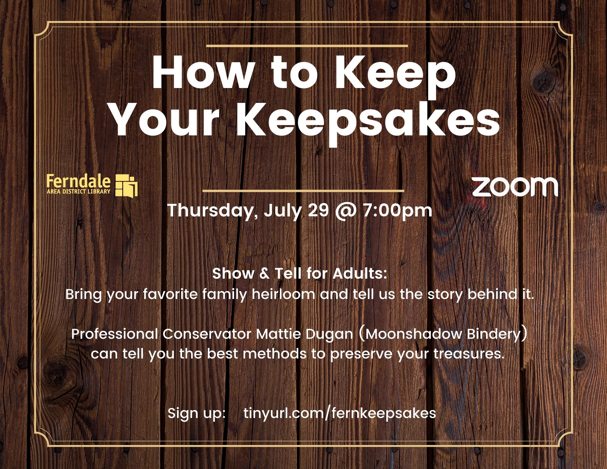 Thursday, July 29 | 7pm https://tinyurl.com/fernkeepsakes <https://tinyurl.com/fernkeepsakes?fbclid=IwAR1bLcdk5F3MqXI-Zx_CKC5mm5n92FI05TufOJzkx-54T-kAaeyqKp6WSIU> We want to hear your stories (& see your treasures). It's Show & Tell for Adults... ....Select one or two treasured family heirlooms and bring them to our Zoom meeting with Mattie Dugan, a local art conservator and owner of Moonshadow Bindery. Tell us the story behind your keepsakes & Mattie will instruct us all on the best steps that we should take to ensure the preservation of these items that represent our family histories. [image: Copy of Copy of How to Keep Your Keepsakes (1).jpg]