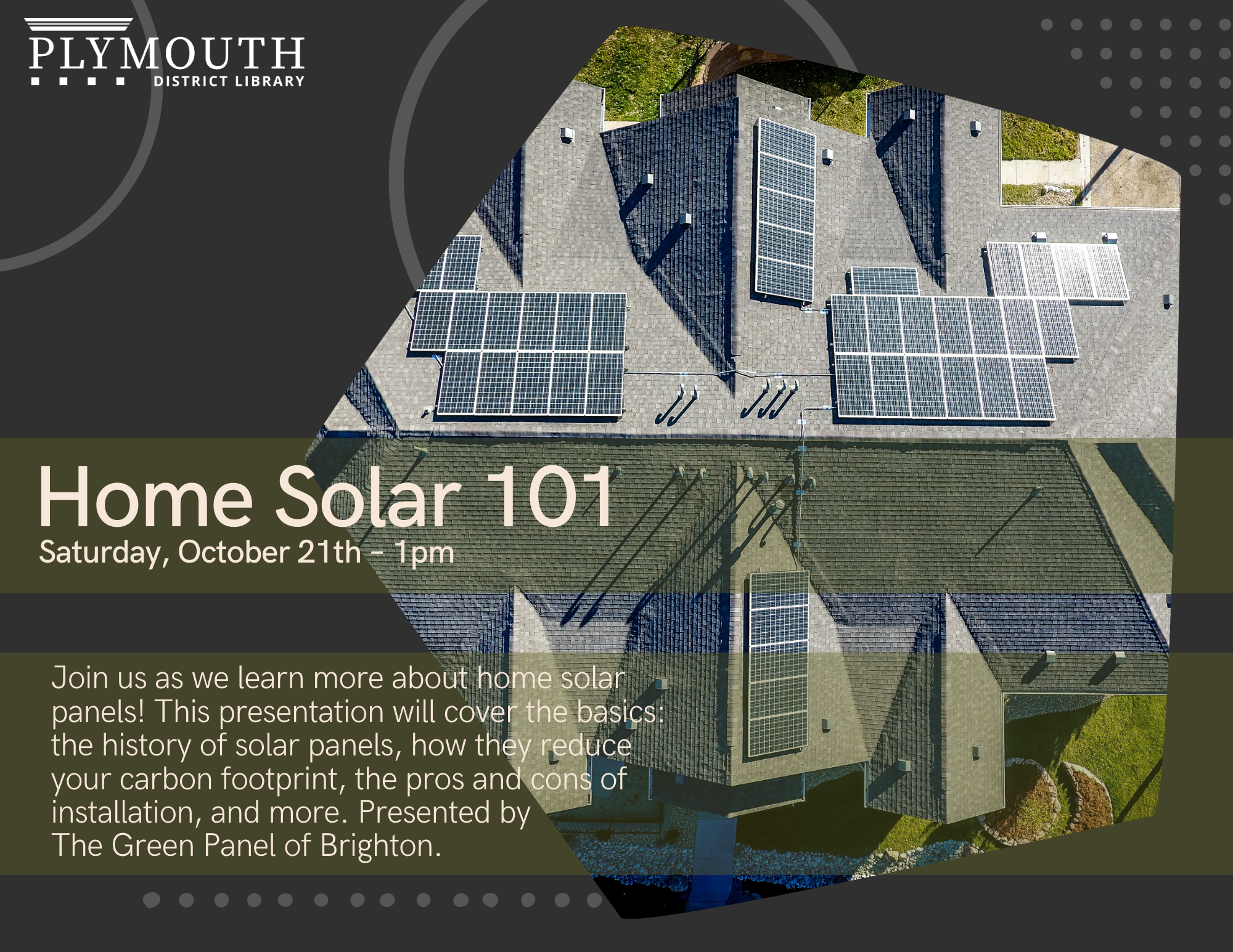 Hi all! Please feel free to share this event with your colleagues and patrons. Flyer also attached! Registration requested here <https://plymouth.librarycalendar.com/event/home-solar-101>. *Home Solar 101* *Saturday, October 21 @ 1pm* Join us as we learn more about home solar panels! This presentation will cover the basics: the history of solar panels, how they reduce your carbon footprint, the pros and cons of installation, and more. Presented by The Green Panel of Brighton. Thanks! - Sarah -- Sarah Winter (she/her <https://pronouns.org/what-and-why>) | Adult Services Librarian Plymouth District Library | 223 S. Main Street | Plymouth, MI 48170 (734) 453-0750 ext. 241 plymouthlibrary.org/ Currently Reading: *Queer Little Nightmares edited by David Ly and Daniel Zomparelli*