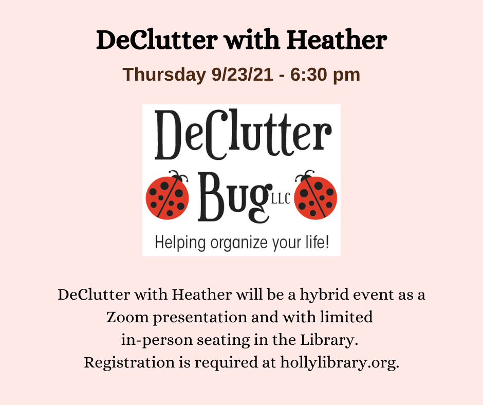 Hello Everyone, Just wanted to let you know of an upcoming "hybrid" event at the Holly Township Library. What: DeClutter with Heather When: September 23, 2021, 6:30pm Where: Holly Township Library, 1116 N. Saginaw St, Holly MI 48442 Limited in-person seating (a few spaces still available) and many spaces still available via Zoom. Registration is required for this event: LINK <https://docs.google.com/forms/d/e/1FAIpQLSdv69iI2y-5Bv56fYxA_H6RolC-LraZ7zRYiu4CY4VITcpBTA/viewform> [image: DeClutter with Heather 92321 FB post.png] Please share this event with your patrons and staff. Questions, email or phone me. Thank you, Tina -- Tina Marie Russette Adult/Teen Services Manager Holly Township Library 1116 N. Saginaw St. Holly, MI 48442 248-634-1754