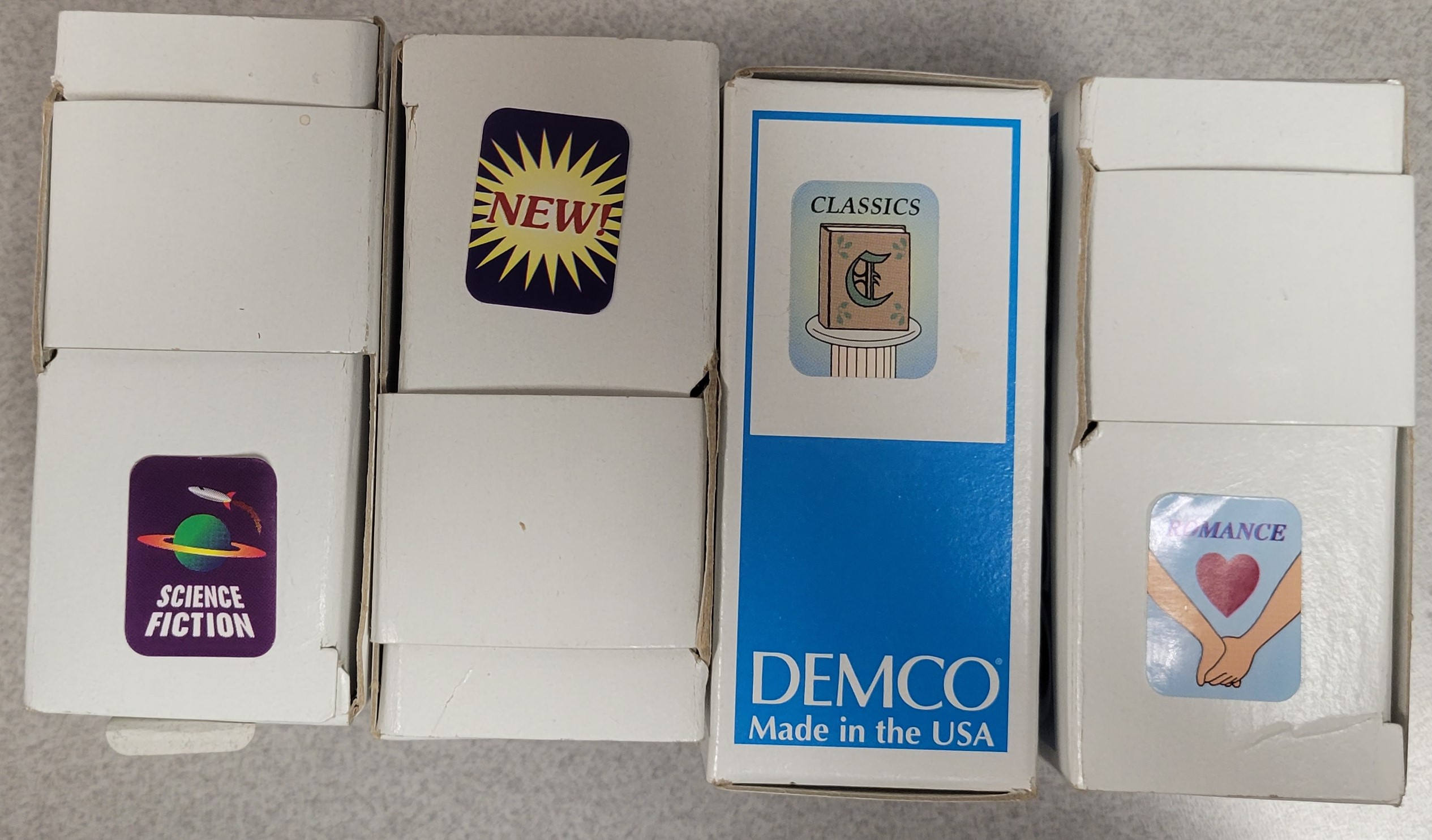 Hello, We have four different spine labels (Science Fiction, New, Classics and Romance) partial boxes that we no longer use. (Picture attached to see label). If you would like them all or a specific one, please let me know along with your RIDES code. Thank you Sara Horn Adult Services/ Local History Librarian Charlotte Community Library 517-543-8859 226 S. Bostwick Charlotte, MI 48813