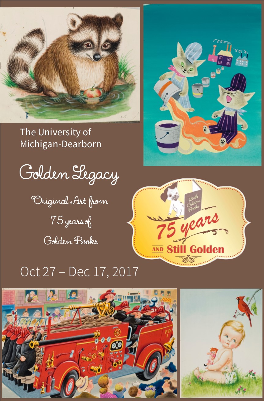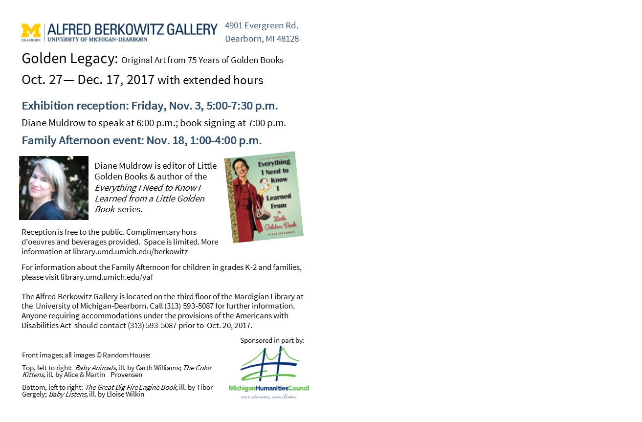 The Alfred Berkowitz Gallery <http://library.umd.umich.edu/berkowitz/> at the University of Michigan-Dearborn is hosting one of the largest public showings of illustration art from one of the best-loved, highly-acclaimed picture book lines, Little Golden Books. The exhibition runs from Oct. 27 through Dec. 17, 2017. There are *extended hours* for this exhibition; please check the gallery's website <http://library.umd.umich.edu/berkowitz/exhibitions/2017/goldenbooks.php> for hours. On loan from The National Center for Children’s Illustrated Literature, the exhibition includes 65 original masterpieces from the beloved Little Golden Books. Classics such as “The Poky Little Puppy,” “Tootle,” “Home for a Bunny,” “The Color Kittens,” and “I Can Fly” will be featured. Famous illustrators included in the exhibit are: Feodor Rojankovsky, Tibor Gergely, Gustaf Tenggren, Martin Provensen, Eloise Wilkin, Garth Williams, Richard Scarry, and others. The guest speaker at the opening reception is Diane Muldrow <http://www.dianemuldrow.com/>. Muldrow is the editorial director at Golden Books/Random House and editor of the famous Little Golden Books. The reception, on Friday, Nov. 3, 2017 from 5:00 to 7:30 p.m., is free and open to the public. Muldrow will be signing books after her presentation from 6:00 to 7:00 p.m. Books will be on sale or you may bring your own. A second event, Family Afternoon with Little Golden Books <http://library.umd.umich.edu/yaf/goldenlegacy.php>, will be held on Saturday, Nov. 18, 2017 from 1:00 to 4:00 p.m. in the Berkowitz Gallery. There will be crafts and activities for children in grades K–2 plus readings from special guest visitors, including Paws the Detroit Tigers mascot. Light refreshments will be provided. The Berkowitz Gallery is located on the 3rd floor of the Mardigian Library at the University of Michigan-Dearborn. The library is marked "ML" on the illustrated campus map <https://umdearborn.edu/about/visit-campus/maps-directions?utm_source=umdearborn.edu&utm_medium=http301&utm_campaign=redirect&utm_content=https%3A//umdearborn.edu/maps_directions>. Call 313-593-5087 <(313)%20593-5087> for further information. This project is funded in part by the Michigan Humanities Council, an affiliate of the National Endowment for the Humanities. [image: Inline image 1] [image: Inline image 2] -- Laura Cotton, Curator Alfred Berkowitz Gallery Mardigian Library University of Michigan-Dearborn 4901 Evergreen Dearborn, MI 48128 lacotton@umich.edu (313)-593-5087 <(313)%20593-5087>