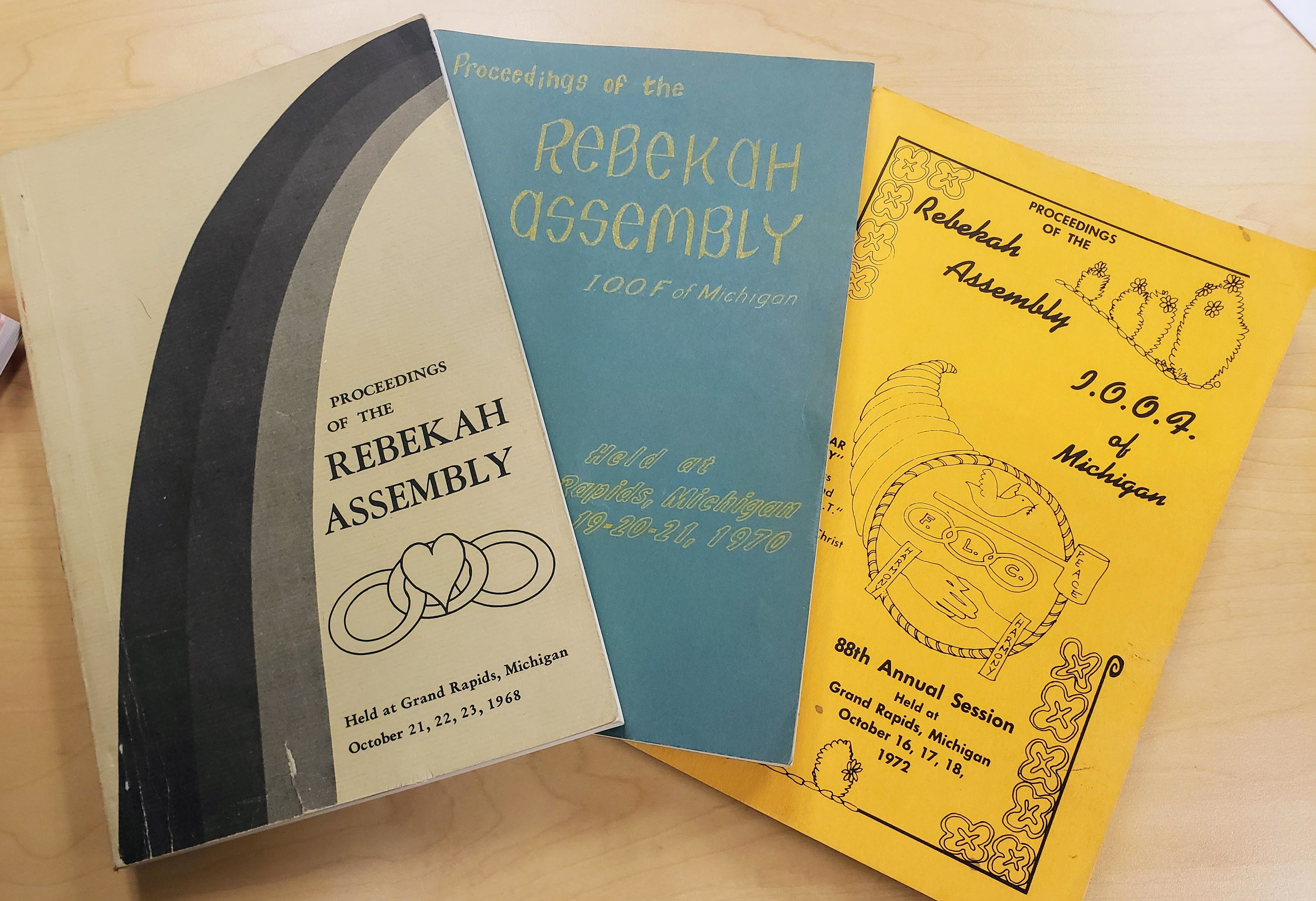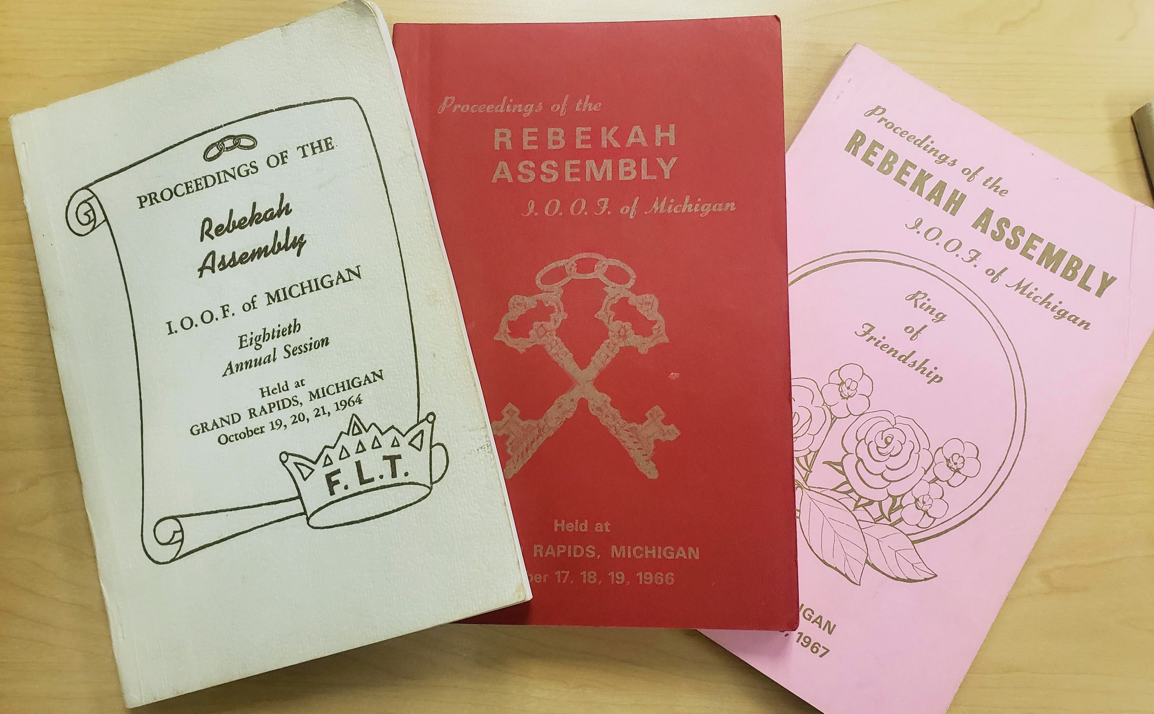 Hello all, A patron donated to us 6 copies of the Annual Session Proceedings of the Rebekah Assembly of the I.O.O.F. of Michigan. The sessions are all listed as taking place in Grand Rapids and are for the years 1964, 1966, 1967, 1968, 1970, and 1972. If anyone is interested in these, please let us know and we can send through RIDES. Sincerely, Stefanie Reed Director Flat River Community Library 200 W. Judd St. Greenville, MI 48838 (616) 754-6359 Ext. 102 gresr@llcoop.org